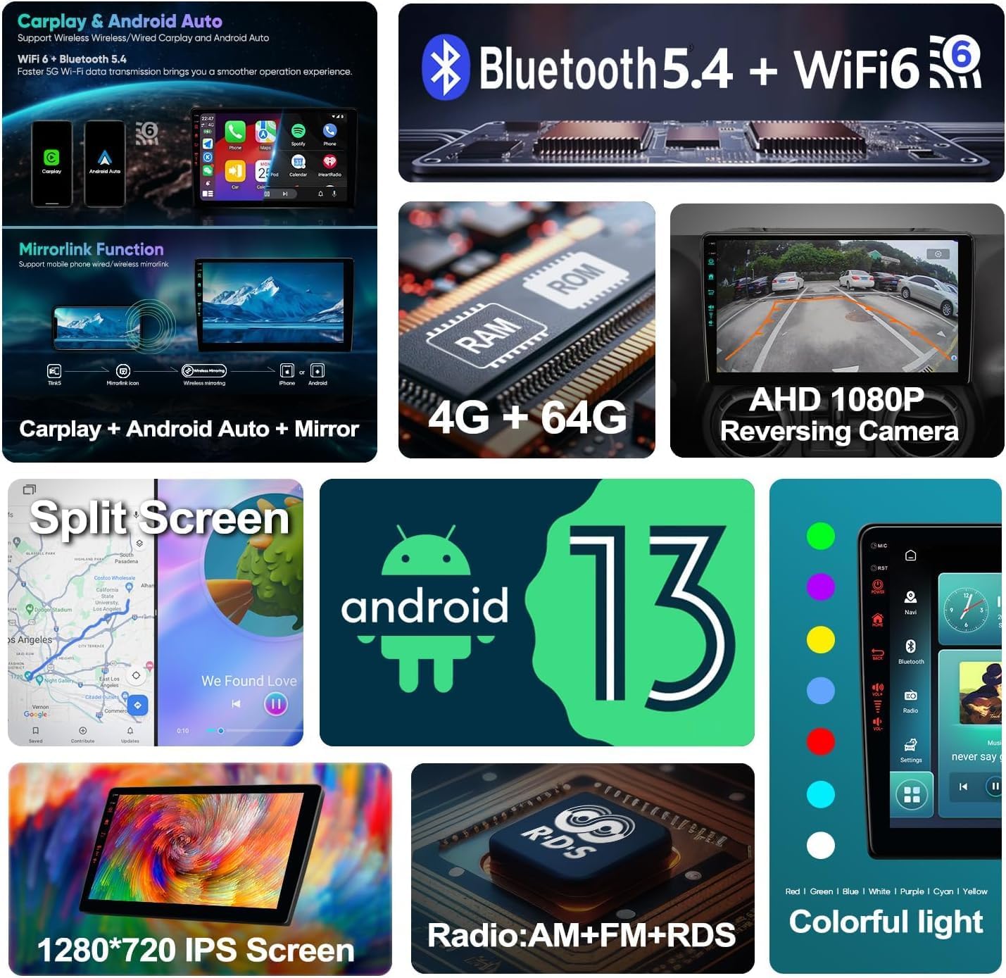 4Ram 64Rom: The real version of Android 13, 4Ram runs fast enough for car navigation without lag, 64G internal storage, and 128G external storage expansion. Accurately locate Google maps, support the download and use of more APPs, and experience in-car entertainment from now on.