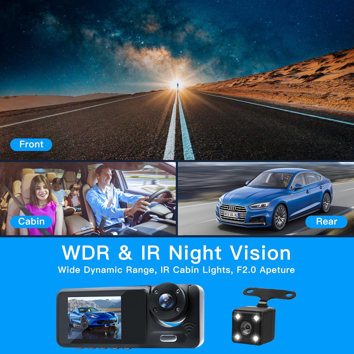 3 Channel Dash Cam WiFi FHD 2K Car Camera 64GB TF Card,TOPGOOSE Front Dash Camera Front and Rear Inside for Cars,Mini Dashcams with Night Vision,Loop Recording,WDR,G-Sensor,APP