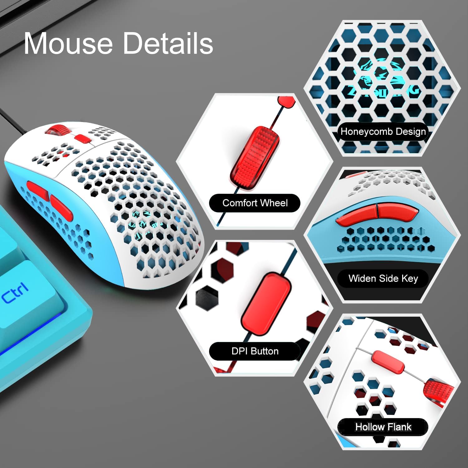 【RGB Honeycomb Gaming Mouse】Wired professional gaming mouse uses hard-core custom chip, high-precision optical sensor, up to 6400 dpi (level 6 / editable), able to withstand 20g acceleration, has 50,000,000 Button life. The high-performance mouse configuration can meet your needs for fast web browsing and gaming.