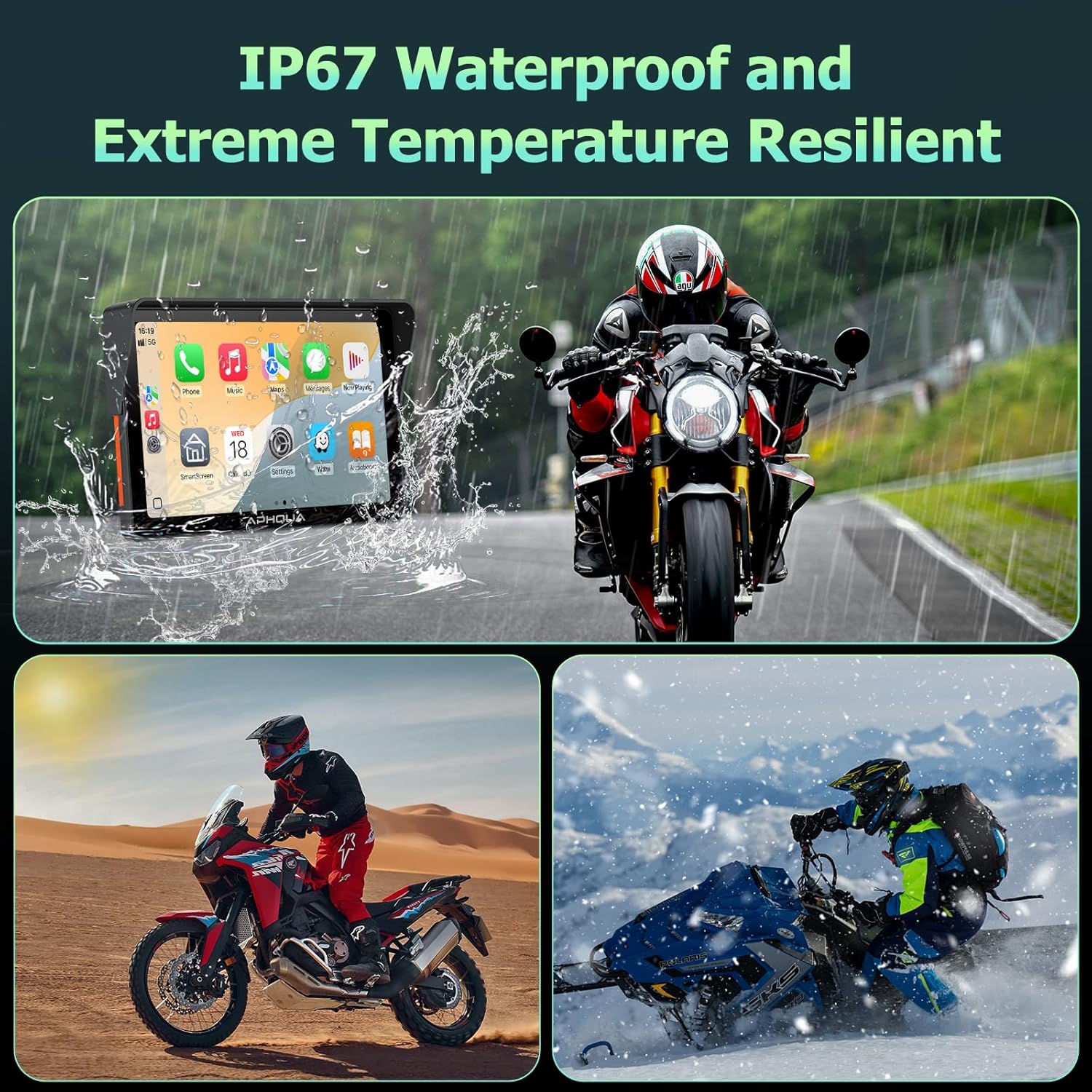 [7-Inch Motorcycle GPS Navigation System with Apple CarPlay & Android Auto]:The APHQUA 722 features a 7-inch waterproof touchscreen. Enjoy easy access to GPS navigation, music, calls, and apps while riding. Perfect for motorcycle enthusiasts who want a smart, connected experience on the road. With a resolution of 1600×600, the display ensures clear visibility, while the IP67 waterproof rating guarantees durability in all weather conditions.