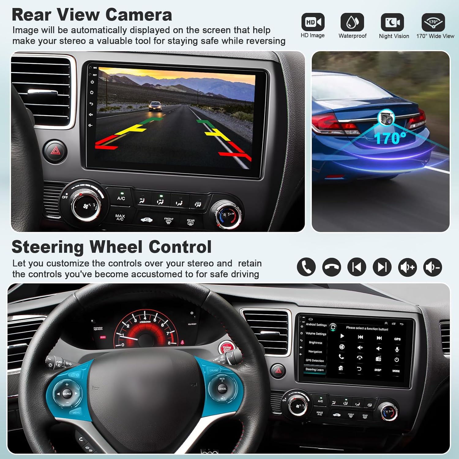 【SWC & Backup camera】With a 170° wide-angle waterproof and night version rearview camera that automatically activates when you shift into reverse. Stay focused on the road with steering wheel controls—change music, adjust volume, and more without lifting a hand. For your US Version 2013-2017 Honda Civic, this car stereo for a safer, smoother drive.