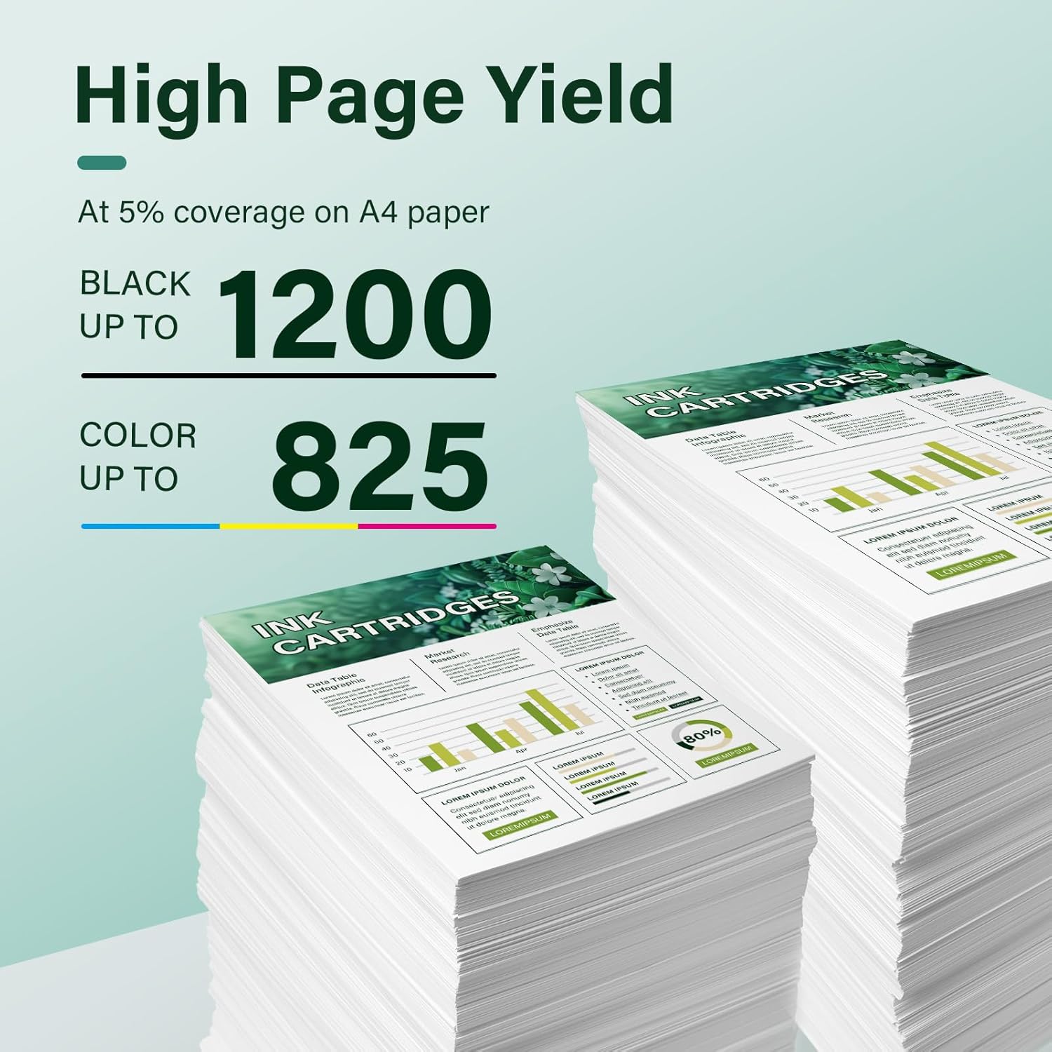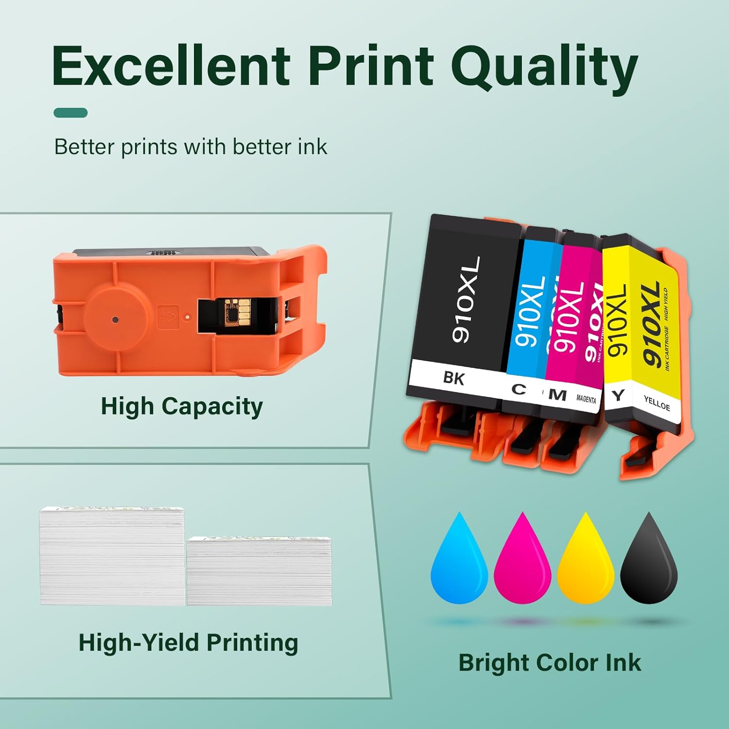 High Page Yield: It yields up to 1,200 pages for each 910XL Black ink,825 pages for each 910XL color ink,at 5% coverage (A4/letter)