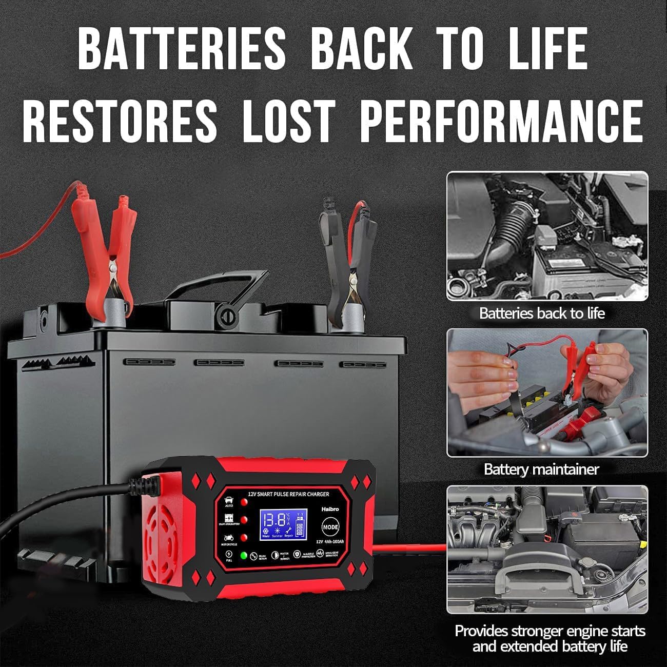 【Efficient Pulse Repair Charger】-The smart battery charger has built-in advanced battery repair mode, automatically detects battery sulfation and acid stratification, adopts the latest pulse repair function to help restore old/idle batteries and extend battery life, bring batteries back to life, getting your vehicles up and running again. NOTE: 12V car battery chargers cannot activate a dead battery or repair a damaged battery. Lithium battery is not included.