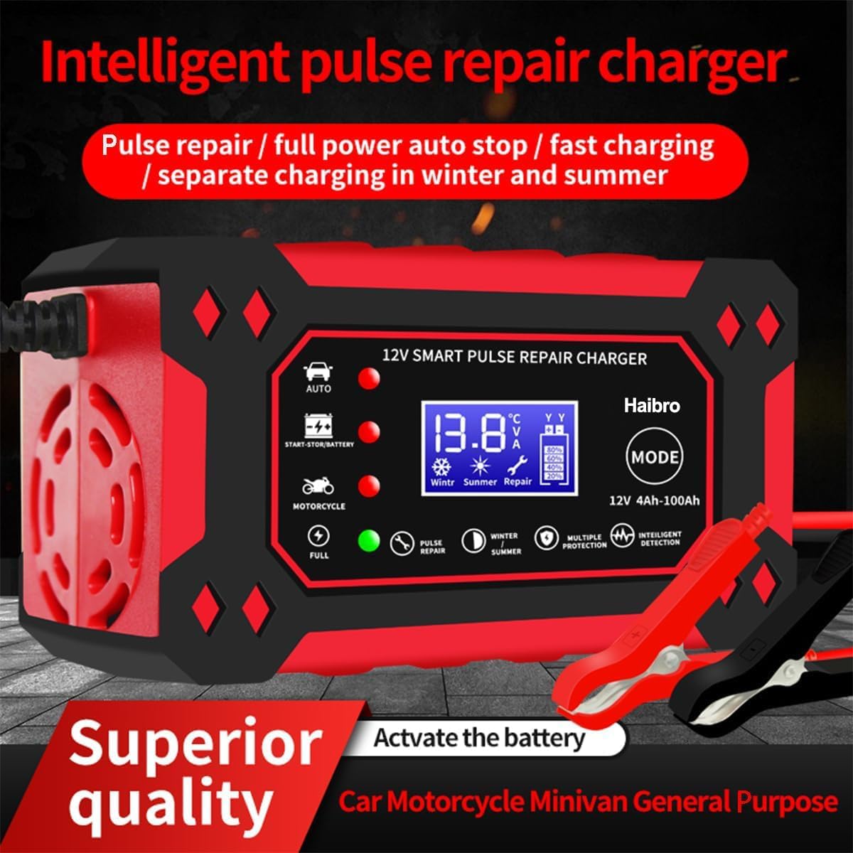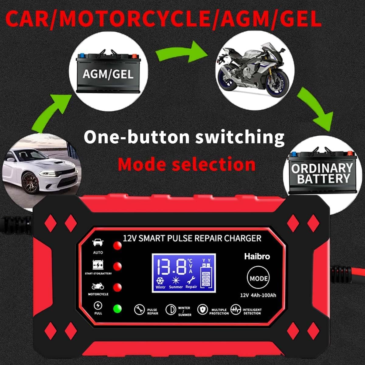 Four Modes :Car/Motorcycle/AGM/GEL/Dry water battery/RepairThe smart car battery charger can be used as battery charger, battery maintainer, trickle charger, and pulse repair charger.