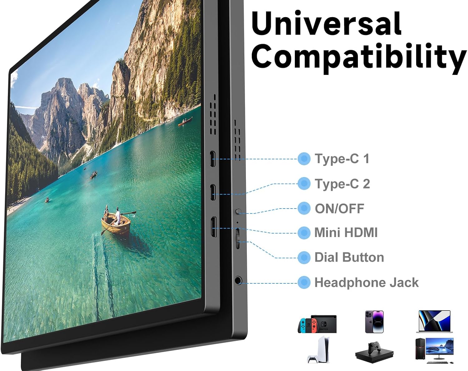 Wide Compatibility, Plug & Play: No drivers required! Features 2 USB Type-C ports and 1 Mini HDMI port for seamless connection to gaming consoles, laptops, tablets, phones, and more; built-in speakers and a 3.5 mm audio jack for enhanced audio.