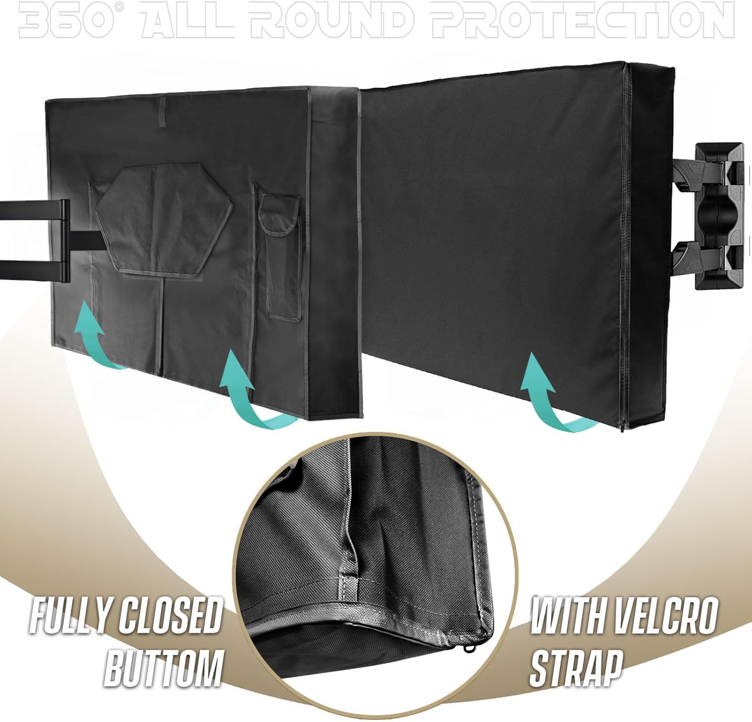 FIT FOR MOST MOUNT: Our TV cover is designed with a smart 3-flap rear design that allows it to fit most TV wall mount brackets, including Double Wall, Single Wall, Swivel Mounts, and Floor TV Stands. (Note: The cover may not provide waterproof protection for ceiling mounts on the back, and unable to fully close the bottom for the indoor TV with stand.)