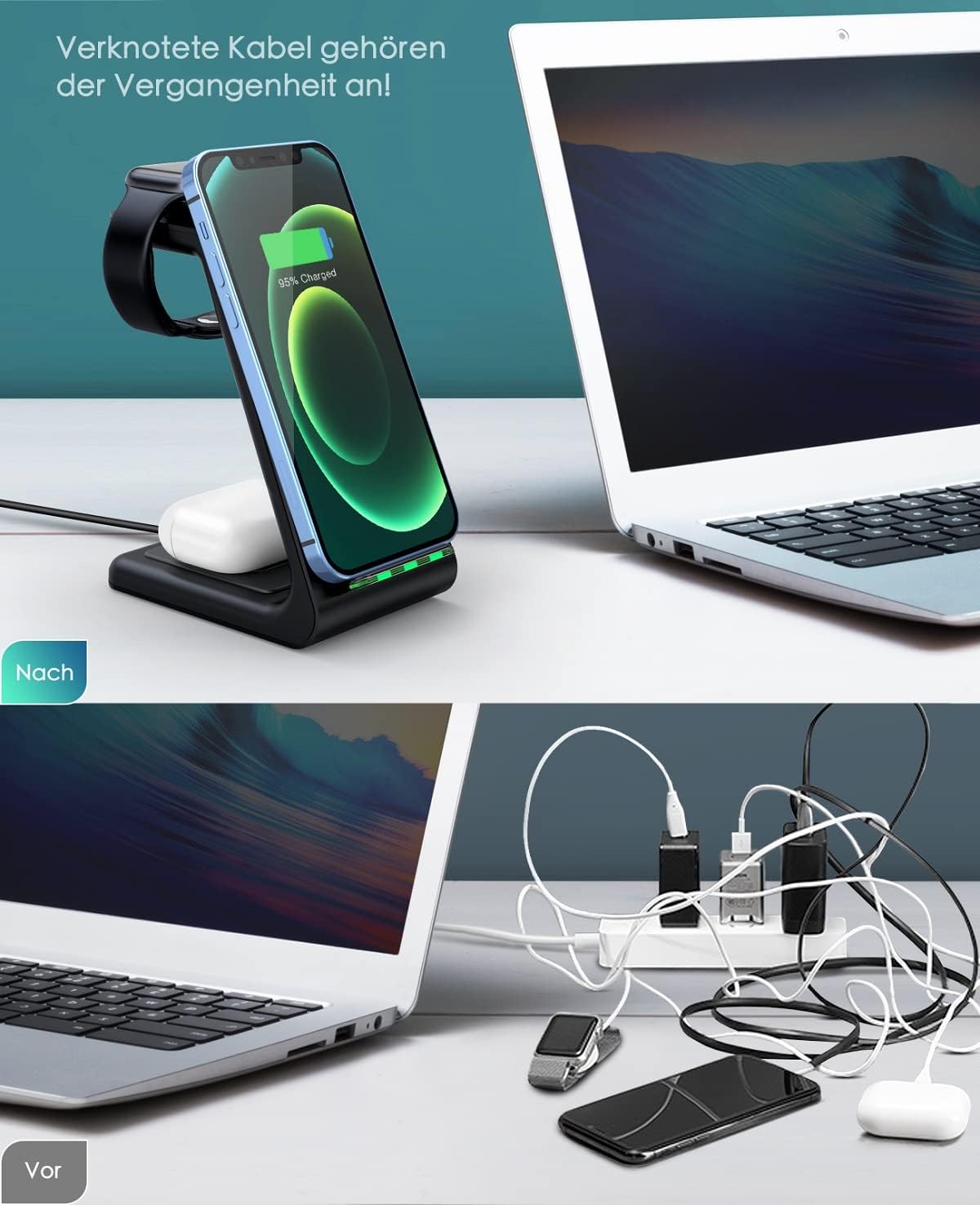 Compatible with all the phones with wireless charging, watches to earbuds, and more. A wireless charger stand satisfies the charging needs of three devices simultaneously. Time to say farewell to the endless troubles brought by tangled wires. Save the time to untangle, and save the space of the desk for a neat look.
