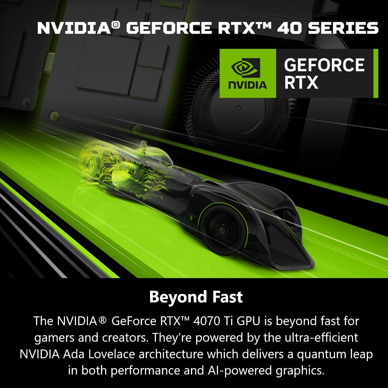 NVIDIA Ada Lovelace Architecture | New Streaming Multiprocessors: Up to 2X performance and power efficiency | Fourth-Generation Tensor Cores: Up to 4X performance with DLSS 3 vs. brute-force rendering | Third-Generation RT Cores: Up to 2X ray tracing performance
