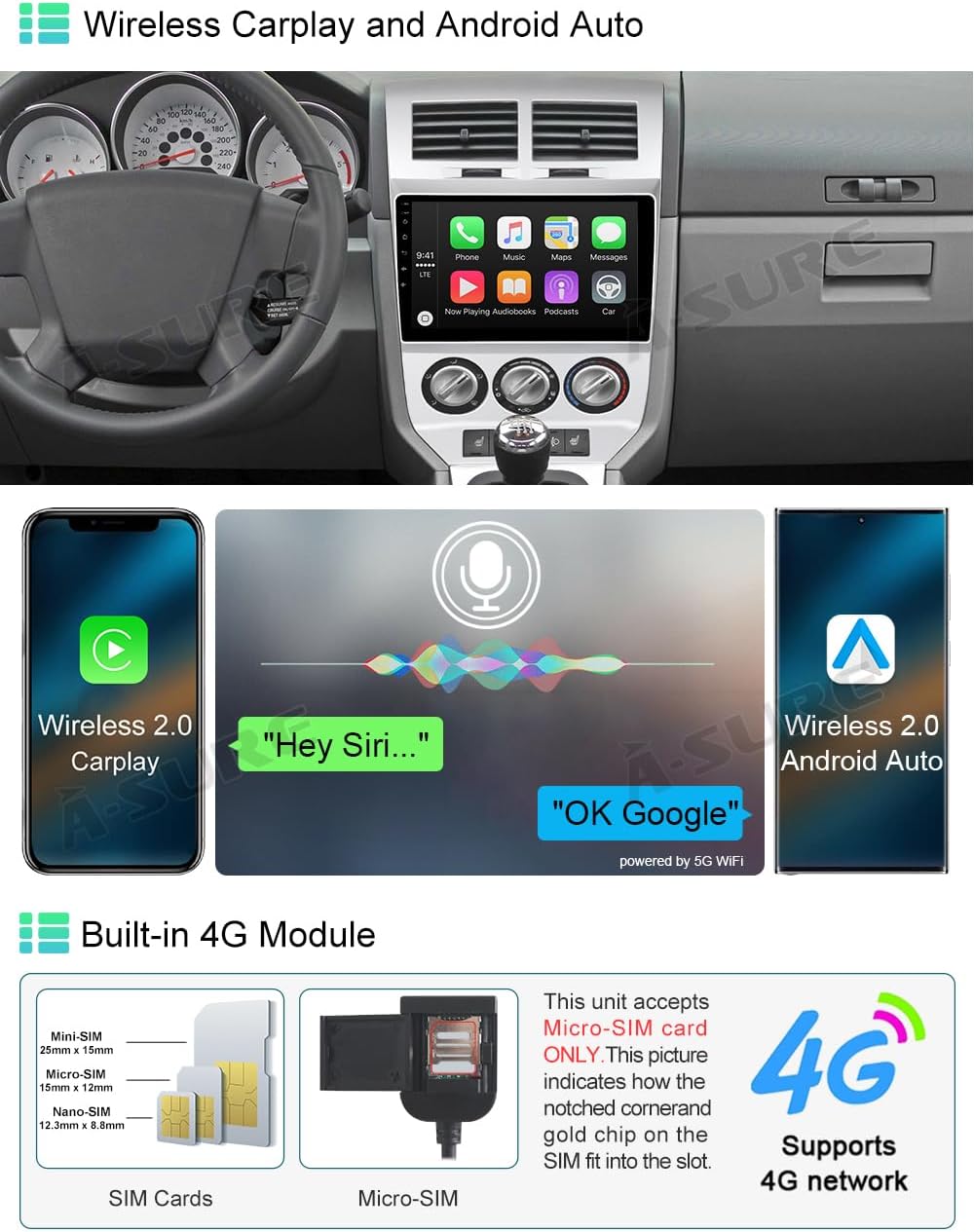 【Wireless/Wired CarPlay & Android auto】Built-in wireless Carplay and wired Android Auto(using the 6 pins USB cable),click carLink icon to start CarPlay or Android Auto function,very convenient to operate,free your hands,keep you stay focused and enjoy entertained while driving