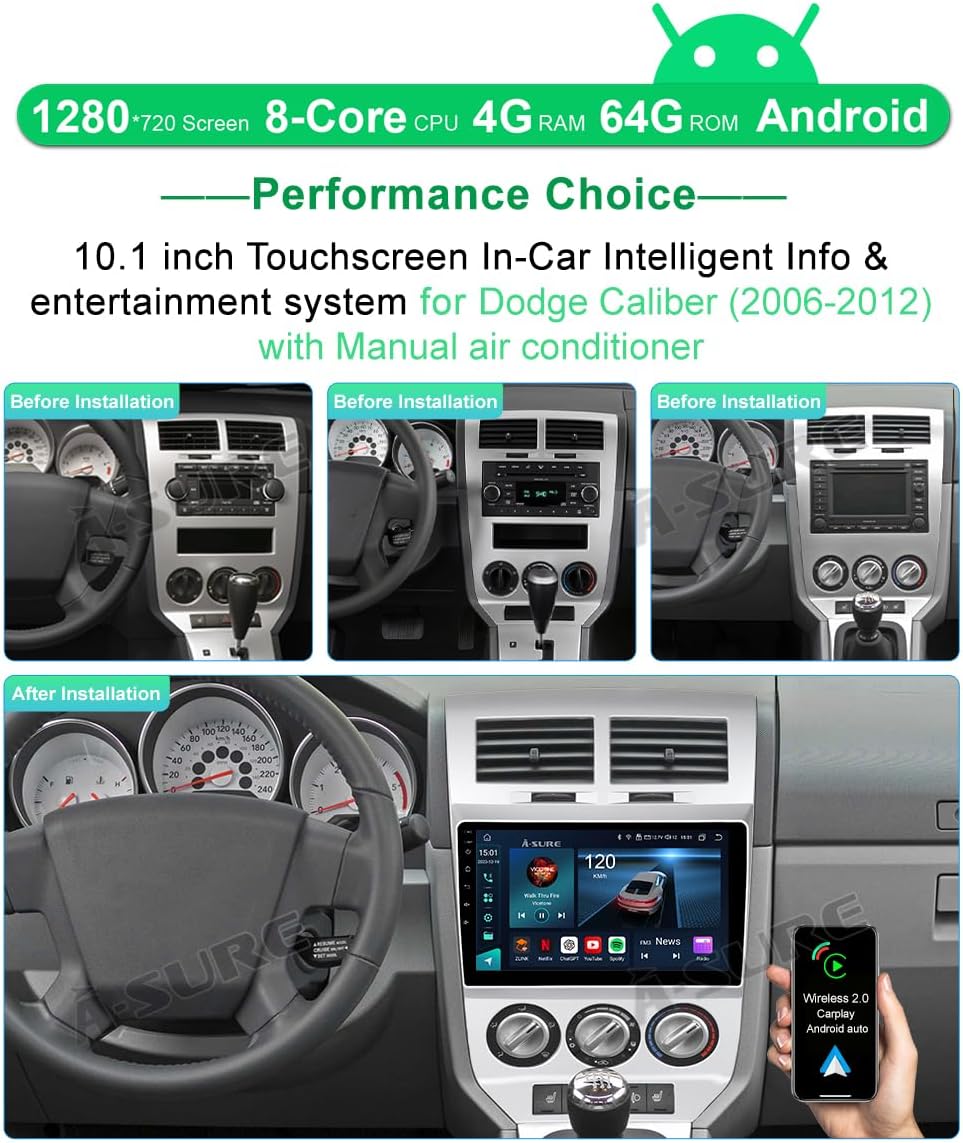 ASURE 10.1 inch Car Stereo Radio Upgrade for Dodge Caliber 2006-2012 Silver Manual AC,8Core 4G+64G Android System Car Dash GPS Navigation Unit with Wireless Carplay Android Auto,1280×720 Touchscreen