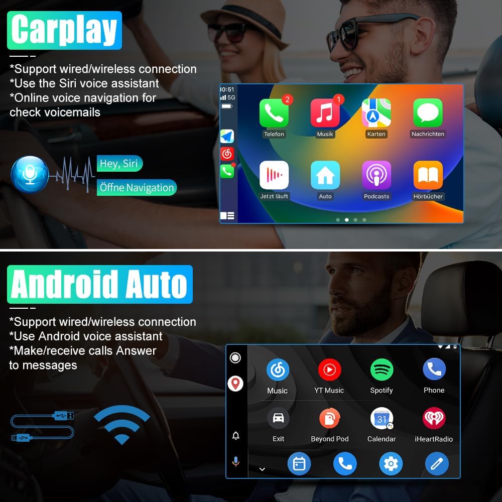 🚙【Wireless Carplay Android Auto】You can choose wired connection or wireless connection to carplay, connect to mobile phone, access mobile phone address book, mail, notification, map navigation, music, video and other information, and realize voice control. Wired Android auto through data cable connection, the wired Android auto car system can closely integrate the user’s Android phone and player.