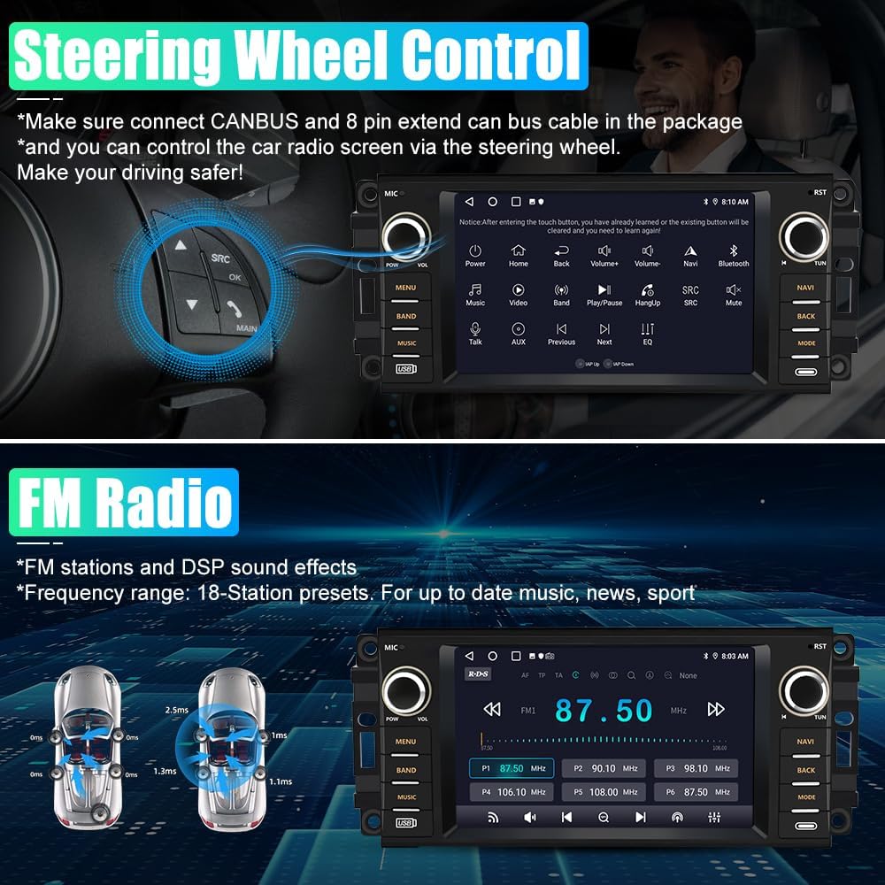 🚚【Bluetooth & FM Radio】For Chrysler Wrangler car stereo with Bluetooth, support phonebook synchronization, hands-free call and mobile music streaming. The built-in microphone picks up your voice and your car speakers let you hear the person on the other side. With FM radio, you can transmit the radio to the car stereo via FM to enjoy the original car stereo, you can listen to real-time traffic, news broadcasts, weather forecasts etc.