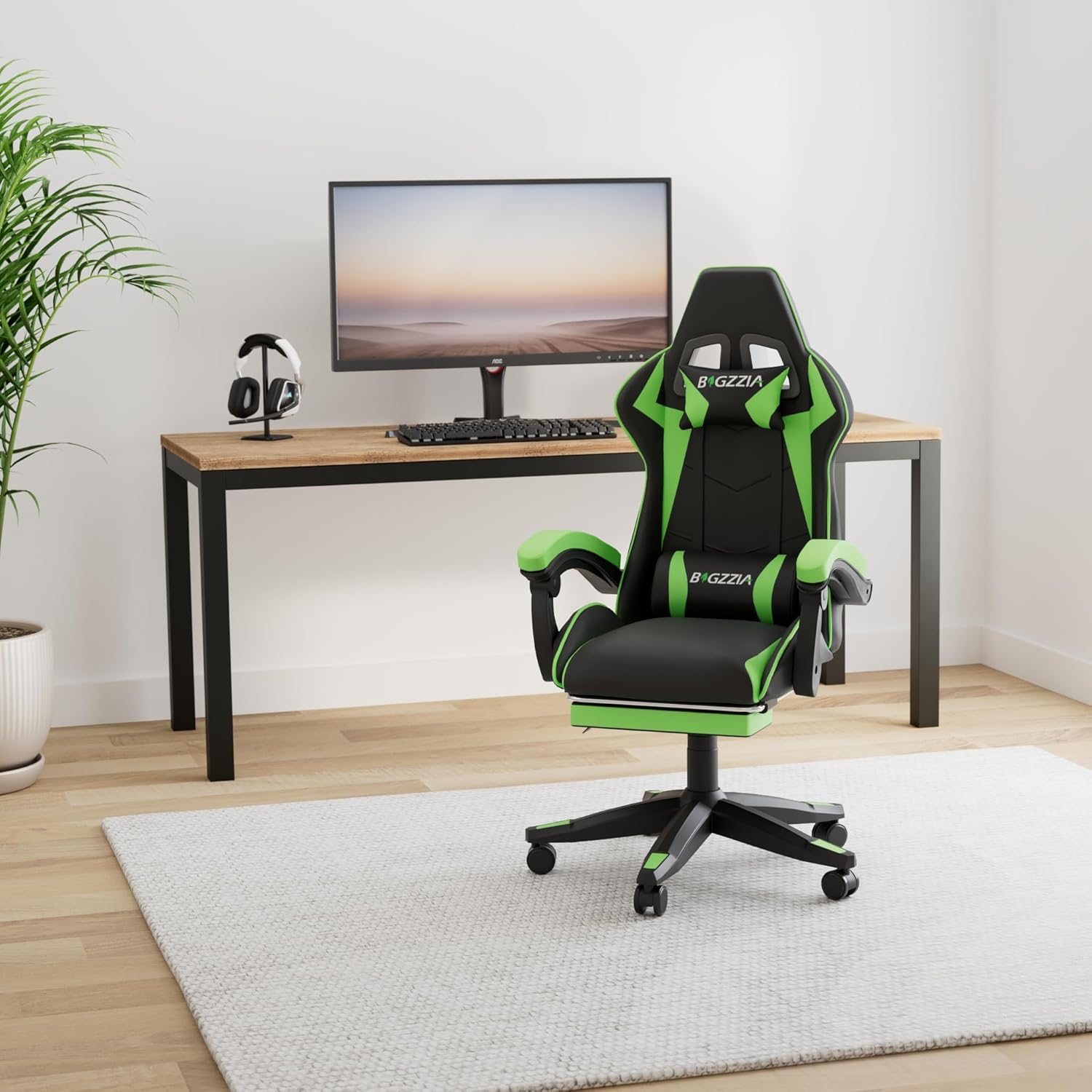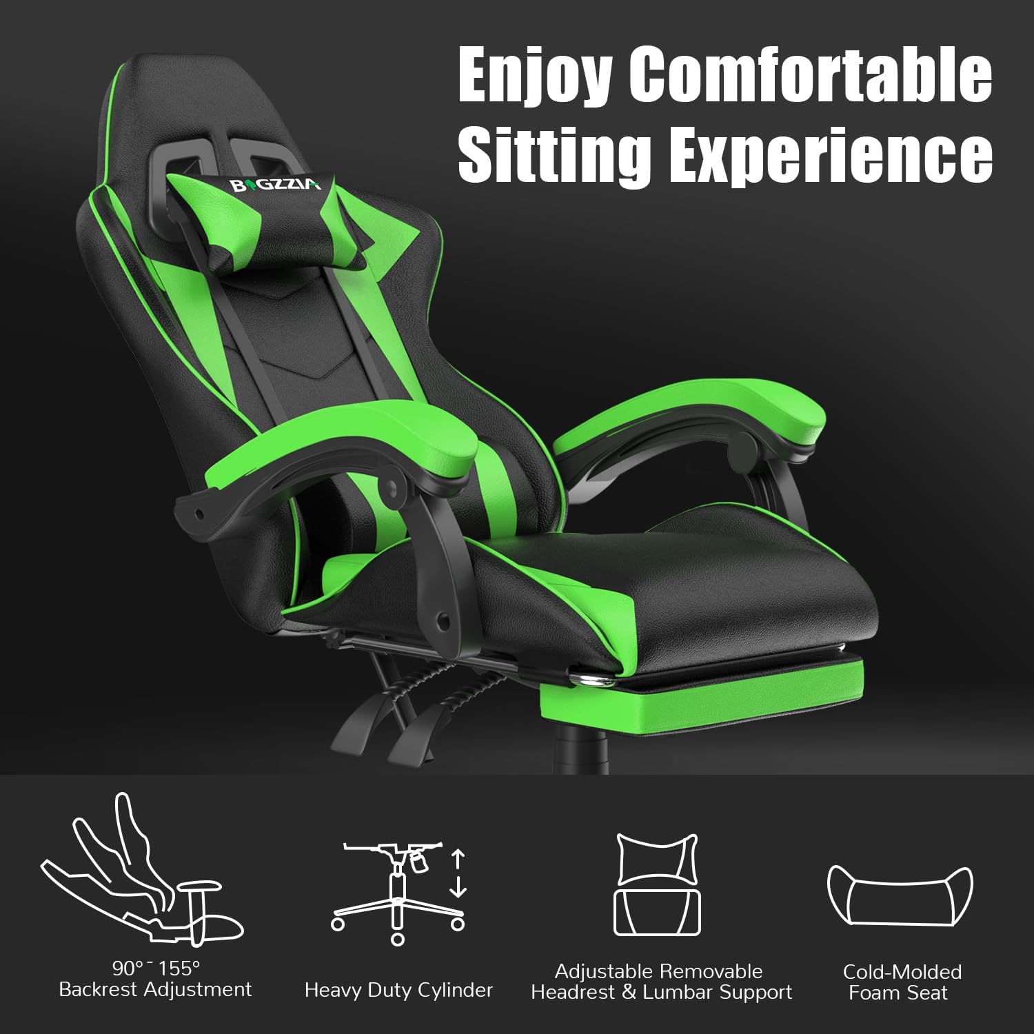 Bigzzia Gaming Chair with Footrest, Ergonomic Game Chairs with Headrest and Lumbar Support, Adjustable Height, Reclining, Racing Style, and 360°Swivel Seat for Computer/Video Game Chair, Green