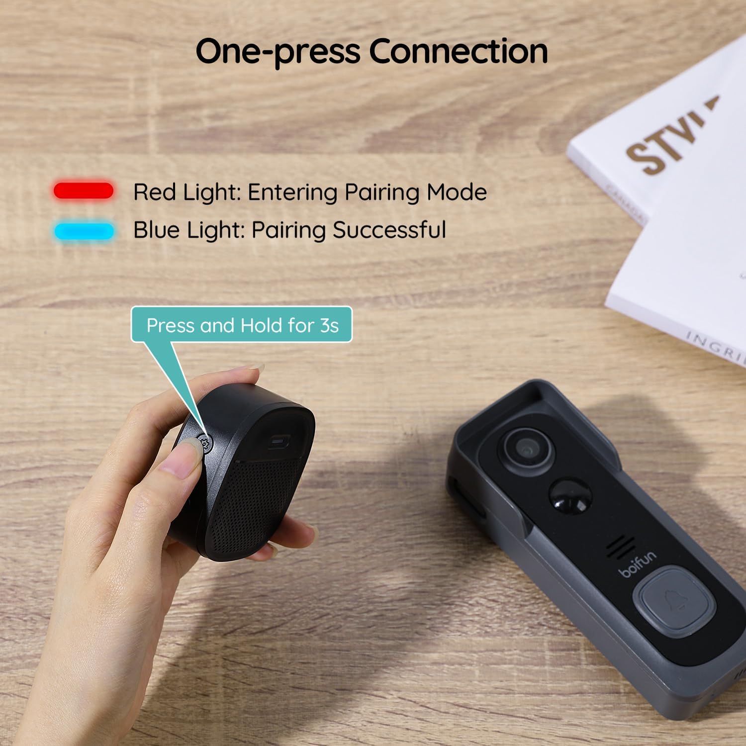 【1 Minute Quick Pairing】Click the SETTING button on the chime to enter the pairing mode (red light flashes). Press the video doorbell button to send the pairing signal. The doorbell rings and the blue light flashes. The pairing is successful!