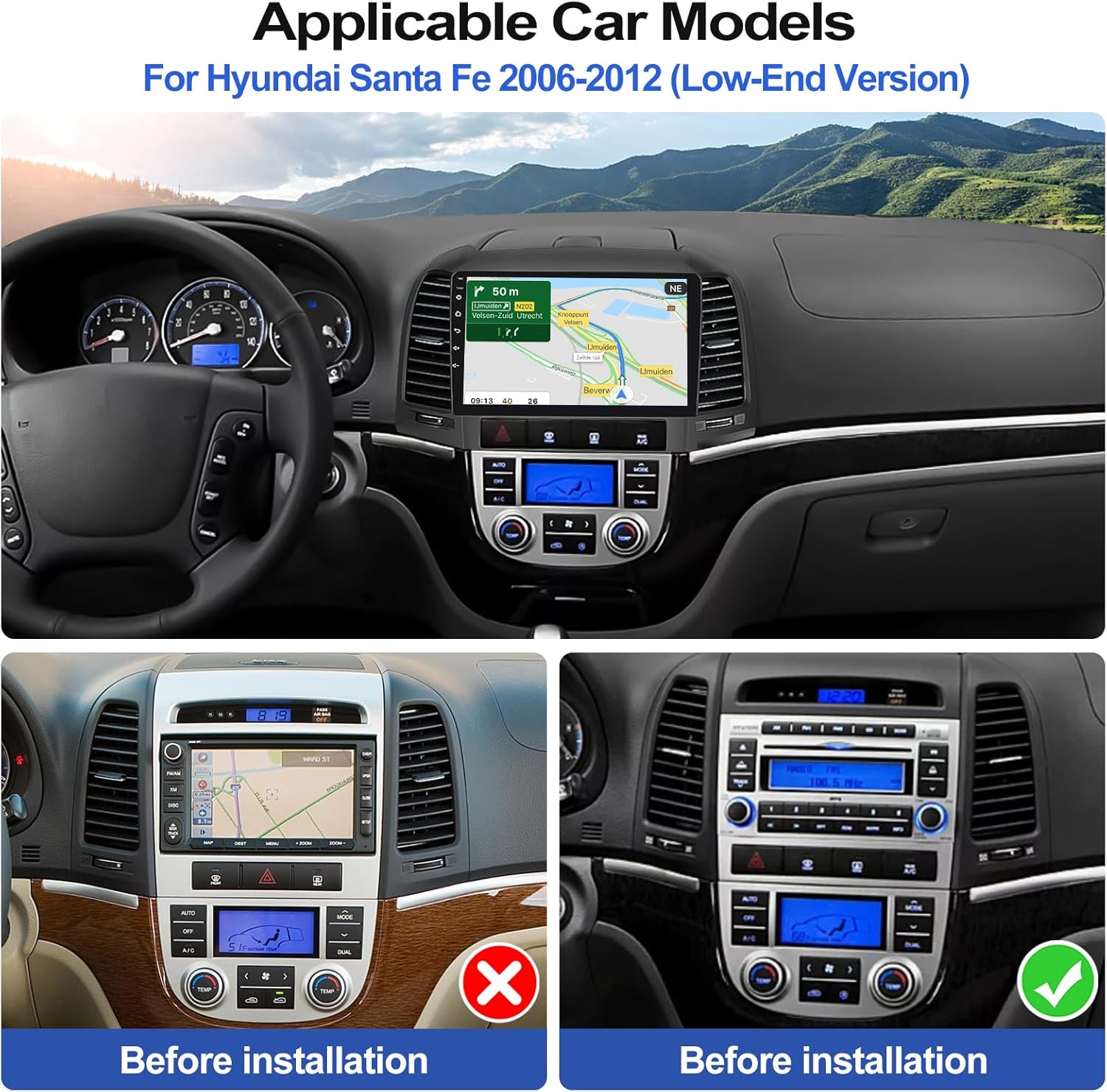 [APPLICABLE CAR MODELS] – With powerful 8-Core CPU, Android 15 operating system, 4GB RAM + 64GB ROM, 9 inch IPS display, the android head unit is compatible with 2006 2007 2008 2009 2010 2011 2012 Hyundai Santa Fe Radio (Low-End Version, Without Canbus), meeting all your needs (If needs Canbus, please reach us)