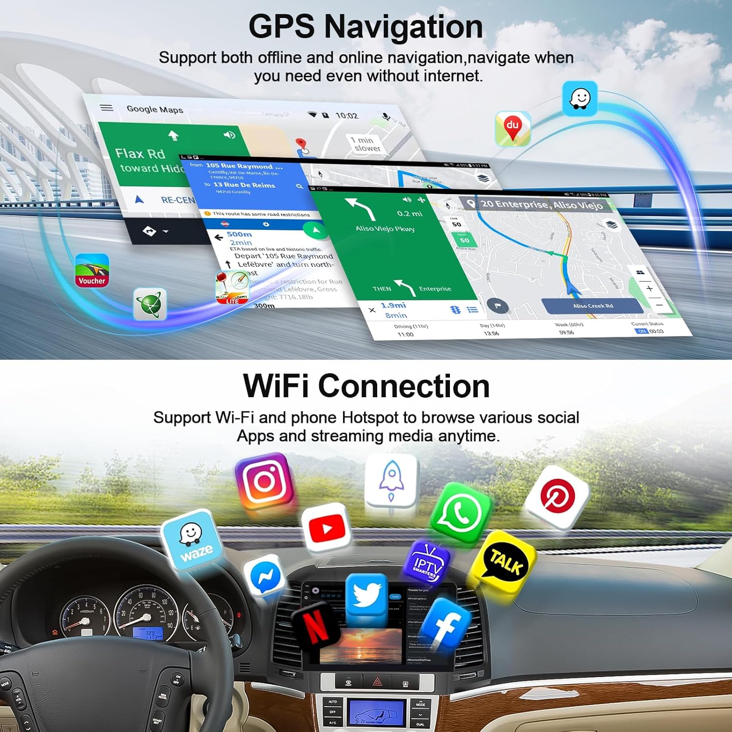 [GPS NAVIGATION & WIFI CONNECTION] – Built-in GPS module for online/offline navigation. Turn on the mobile hotspot on your phone, various 3rd party free apps from google play store is available