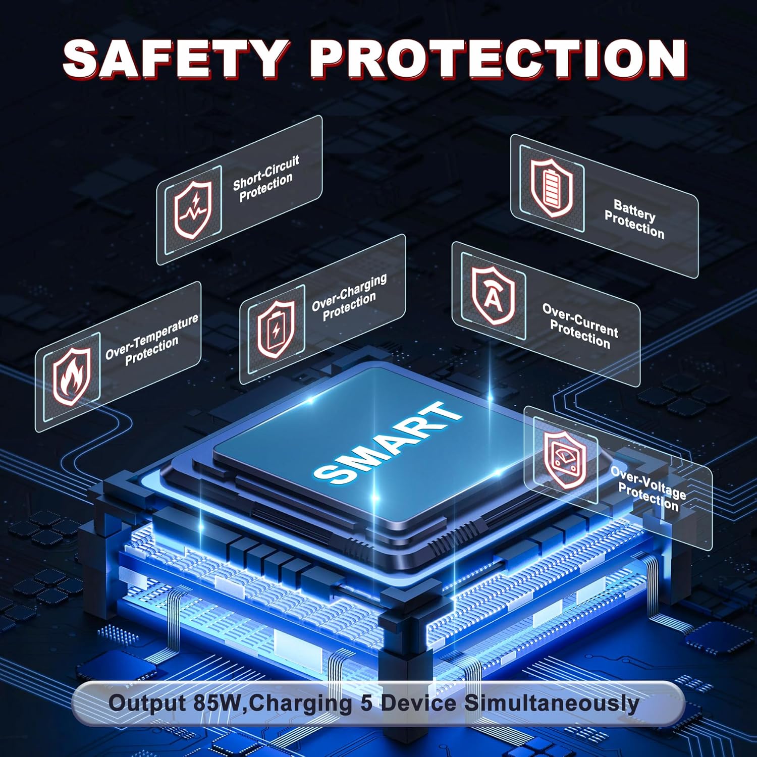 Charging Station for Multiple Devices, 85W 4 Ports Charger Station with Powerful 18W PD USB C Ports, 15W QI Wireless Charger and 3 USB 5V / 4.8A Charging Ports Compatible with iPhone iPad, Tablets