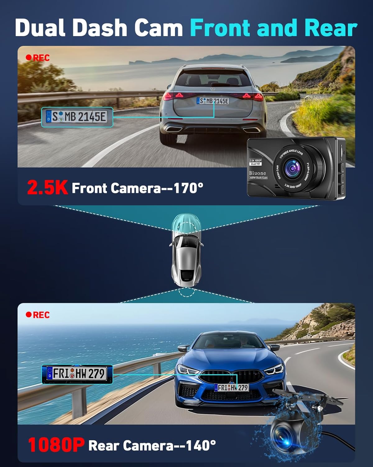 [2.5K+1080P Dual Dash Camera with Wide Angle]—This 2.5K(2560*1440P@30fps) dash cam front and 1080P(1920×1080@30fps) rear dash cam can help you read key details such as road signs and vehicle license plates more clearly, this dash camera for cars with a 170° front wide-angle and a 140° rear wide-angle, this system expands your recording range, eliminating blind spots for a safer and more reliable driving experience