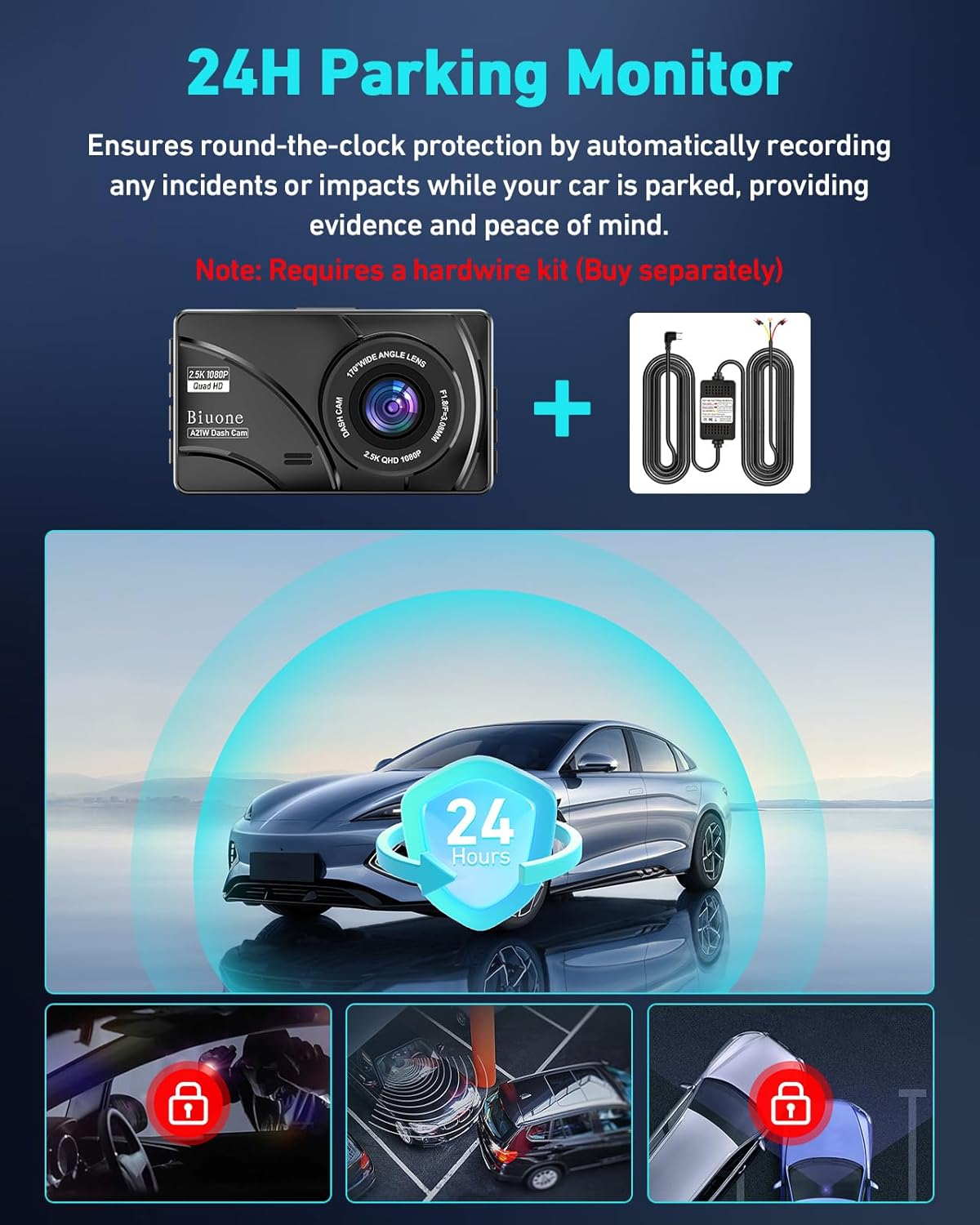 [24/7 Parking Monitor & G-Sensor Dashcam] — The car dash cam with high-performance G sensors and 24-hour parking monitor, automatically records and saves footage during emergencies. If the vehicle is involved in a collision, it will instantly lock the current video as evidence. It also has a 24 hours Parking Monitor available on the dashcams for cars to record continuously for 24 hours ( Need purchase hardware kit separately to achieve)
