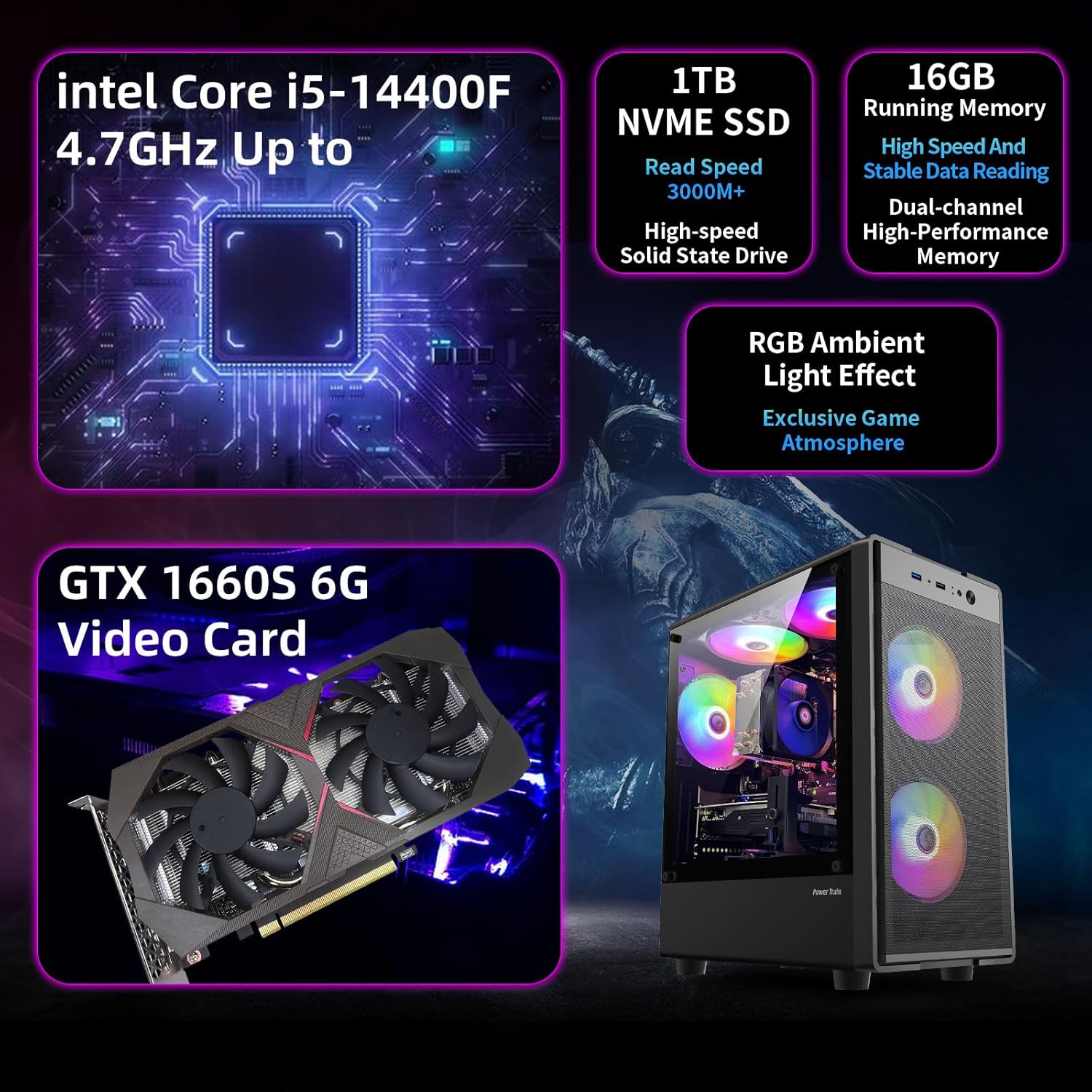 【PC Gaming System】This gaming PC is loaded with Intel Core I5-14400F up to 4.7GHz and NVIDIA GeForce GTX 1660 Super 6GB graphics card, allowing you to experience top-notch gaming performance. This system features 16GB of high-speed memory and an M.2 1TB NVMe Solid State Drive for lightning-fast load times.