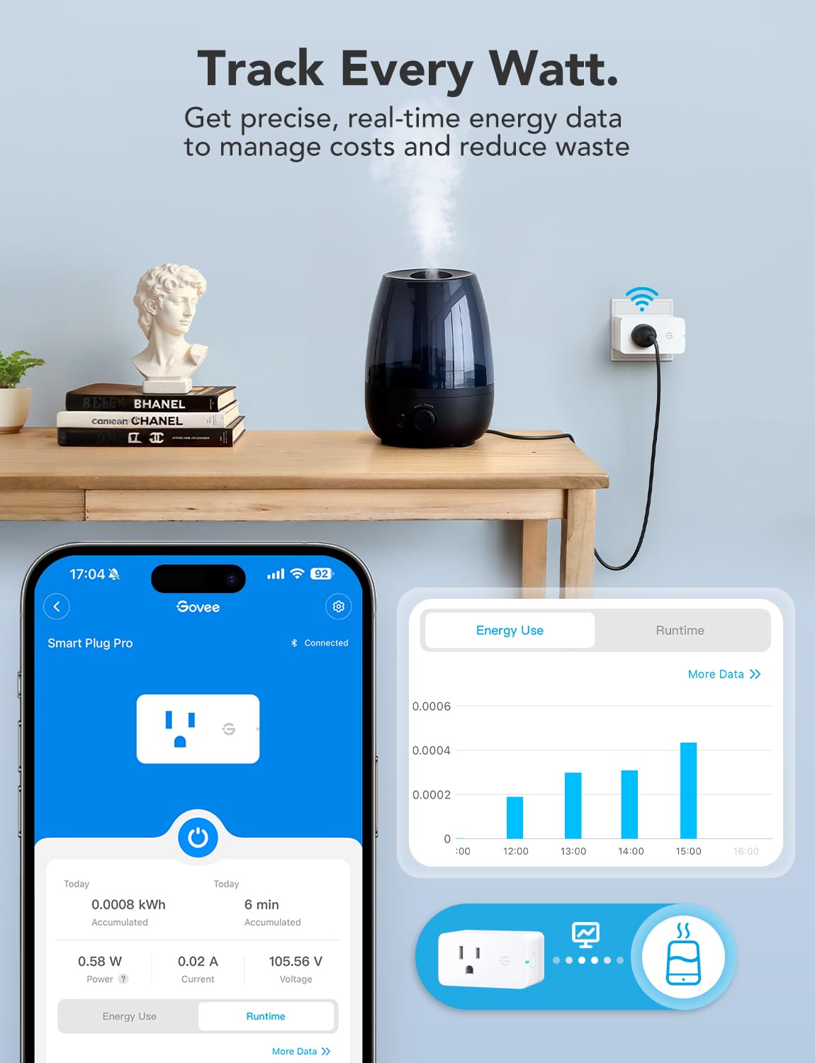 Real-Time Energy Monitoring: Smart plugs track the real-time power, current, and voltage of your plug-in devices on Govee Home App. Supports reviewing data daily / weekly / monthly and up to 1 year to effectively save energy and reduce waste.