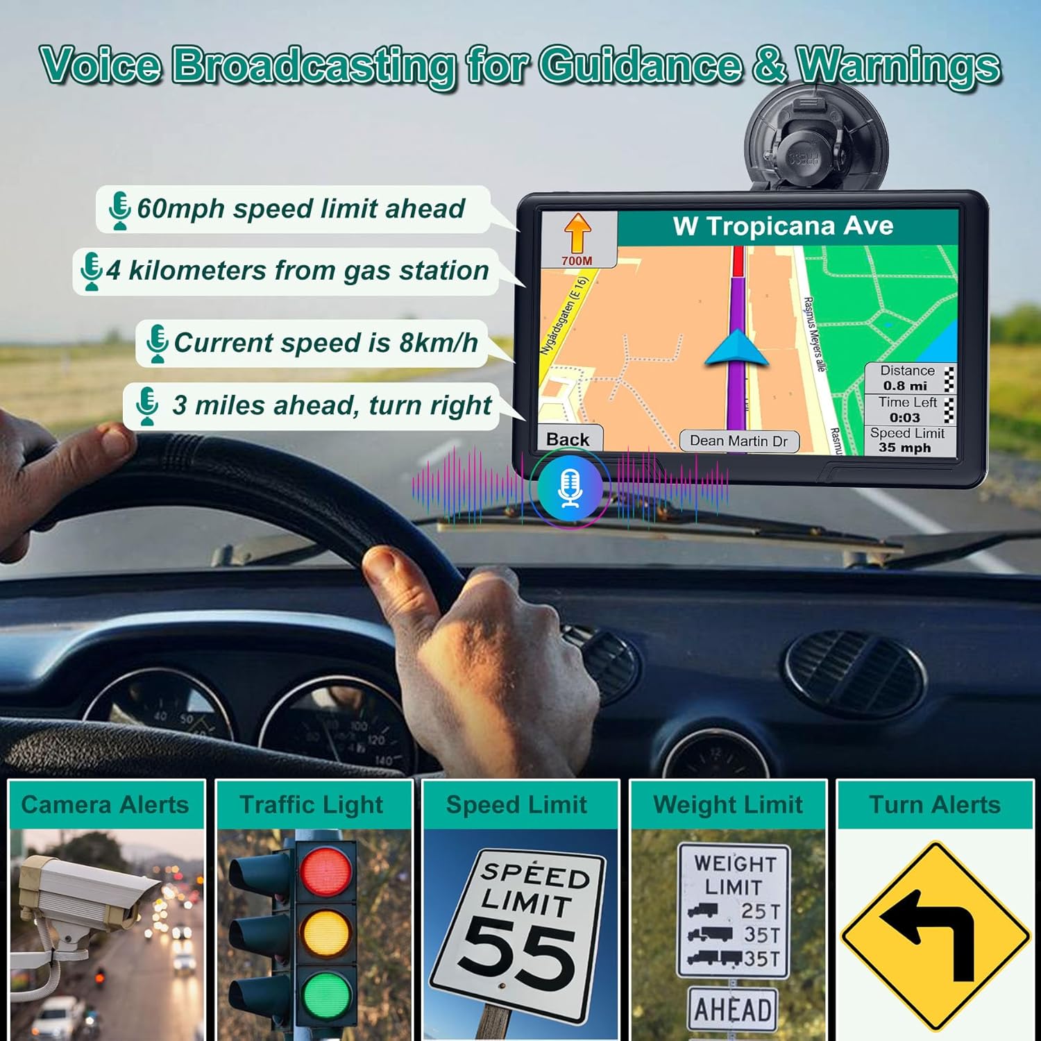 【Smart Voice & Visual Navigation】 The GPS navigator offers 29 optional language and real-time audio and visual notifications. The car GPS keeps you informed about the current speed limit, cameras reminder, route planning, road names broadcasting, current speed, and lane assistance, ensuring you never miss a turn or important update. Additionally, this trucker gps also displays the remaining distance and estimated arrival time, helping you plan your journey more effectively.