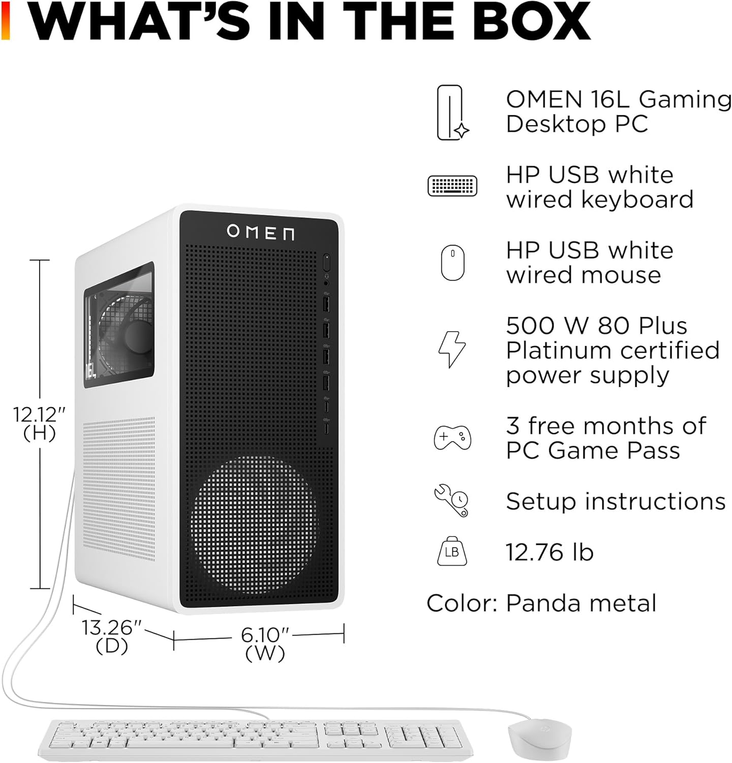 Unwind with the OMEN 16L Gaming Desktop PC. With an AMD Ryzen 5 8500G processor and high-performance graphics, it delivers elevated performance in a compact size. Customize your PC with RGB effects through OMEN Light Studio and get personalized settings recommendations with OMEN AI. The 16L is the perfect companion for your next adventure. This HP computer comes with an HP USB white wired keyboard, HP USB white wired mouse, 500 W 80 Plus Platinum certified power supply, setup instructions, and 3 months of PC Game Pass included. HP is here to help. This HP computer comes with 1-year limited hardware warranty and 1-year limited technical support for software and initial setup.