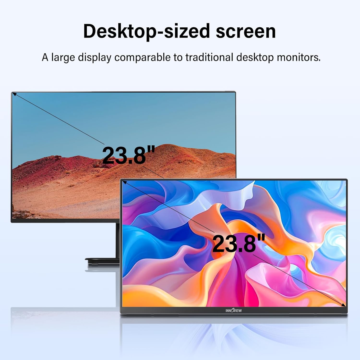 【InnoView 23.8″ 1080P Portable Monitor】The 23.8″ portable monitor offers expansive viewing.This 23.8-inch portable monitor is lightweight and slim, allowing you to move it around the room at will.Making it the perfect second screen for enhancing your workflow, entertainment on the go.Perfect for professionals and gamers alike.