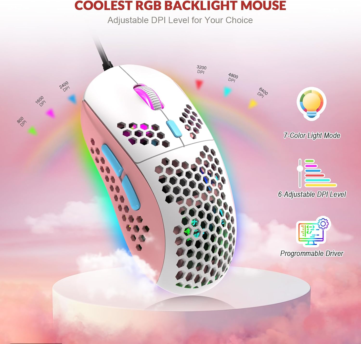 1)7 Buttons Design: Contains 6 programmable buttons and 1 RGB button.through the driver software you can easily custom settings. 2)Ergonomic design and comfortable grip.The honeycomb hollow design is conducive to heat dissipation of the mouse and preventing hand perspiration.