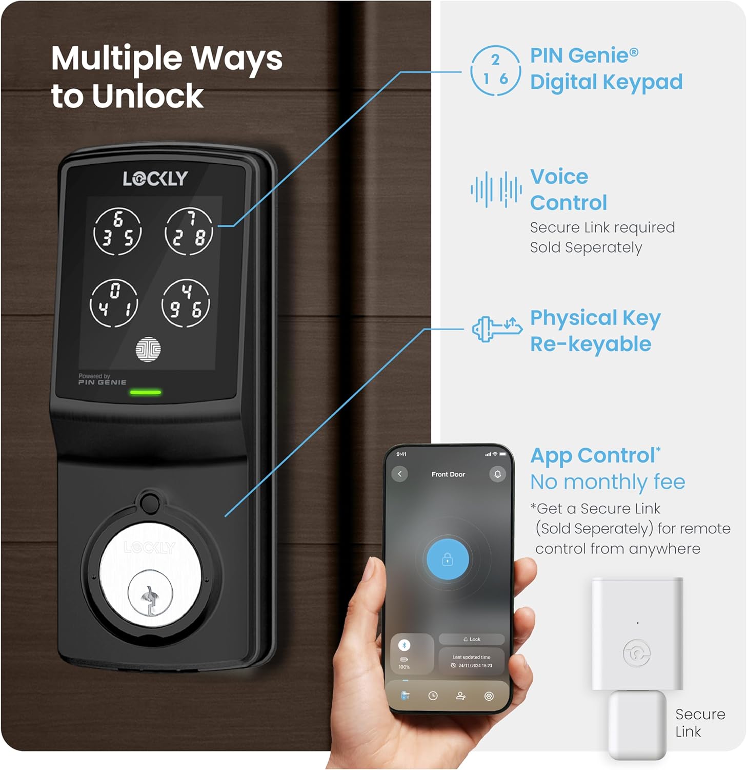 Multiple Ways to Unlock: Lockly smart lock for front door, your home, Airbnb rental property management and offices with high security and reliability – Patented PIN Genie digital keypad + Smartphone APP control + For Alexa & Hey Google Voice Control (with the optional Wi-Fi hub) + Physical key.