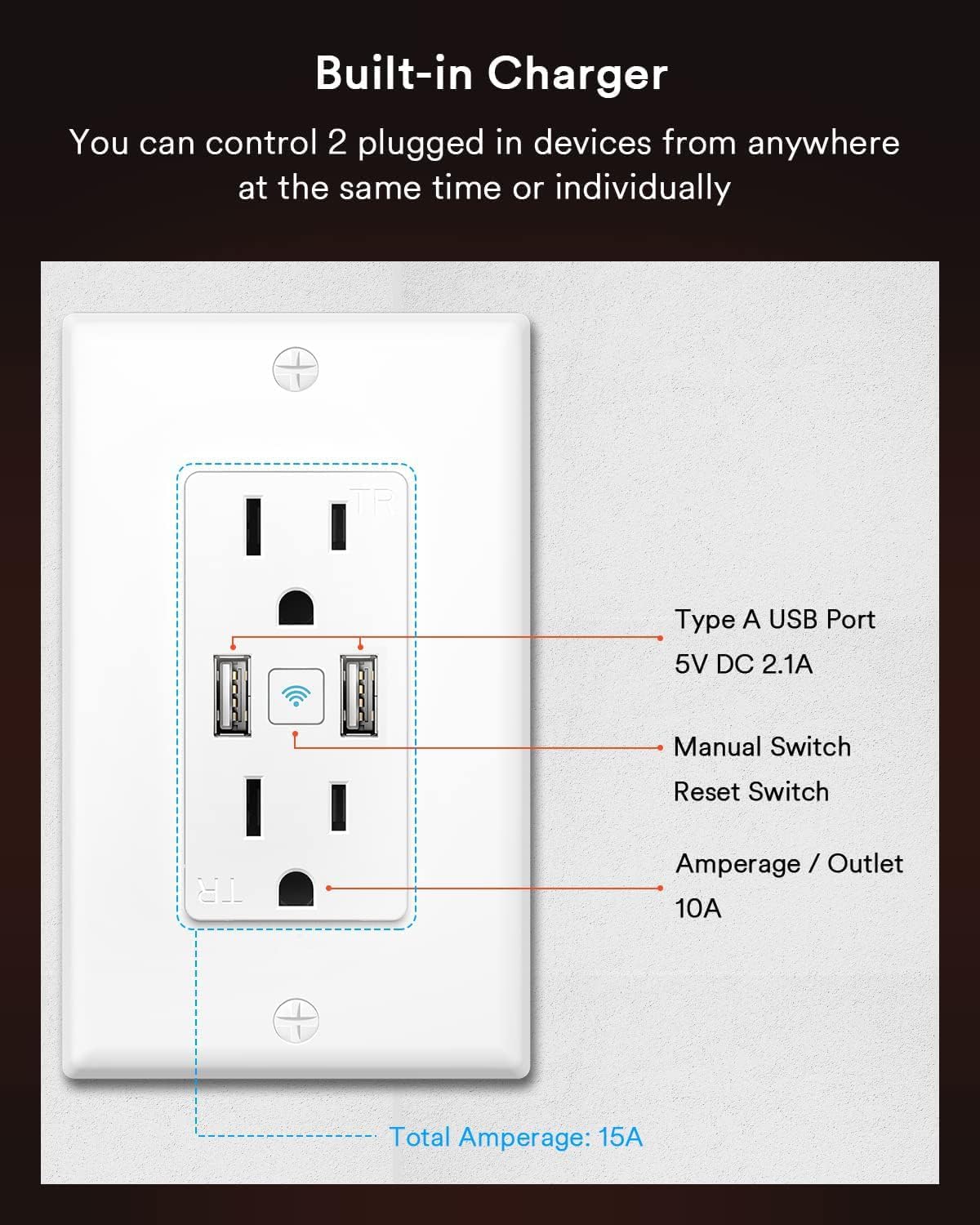 Dual Oultet and USB Outlet: With our Wi-Fi Smart Wall Outlet featuring dual plugs and 2 USB ports, you can control two devices independently, providing seamless management of various electronics in your home. With 2 USB A and 125VAC 60Hz Max.10A(Single outlet),15A in total USB output 5VDC.Max. 2.1A(Each), 2.1A in total