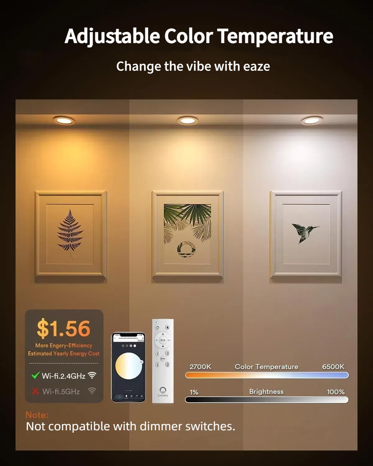【Variety Lighting Needings】Lumary recessed lights have 16 million colors and 1%-100% dimmable brightness making home more vibrant. Set the mood from tunable 2700k-6500k warm white to cool daylight options for reading or relaxing. View the instructions video to pair the BT controller with lights. Not work with dimmer switch