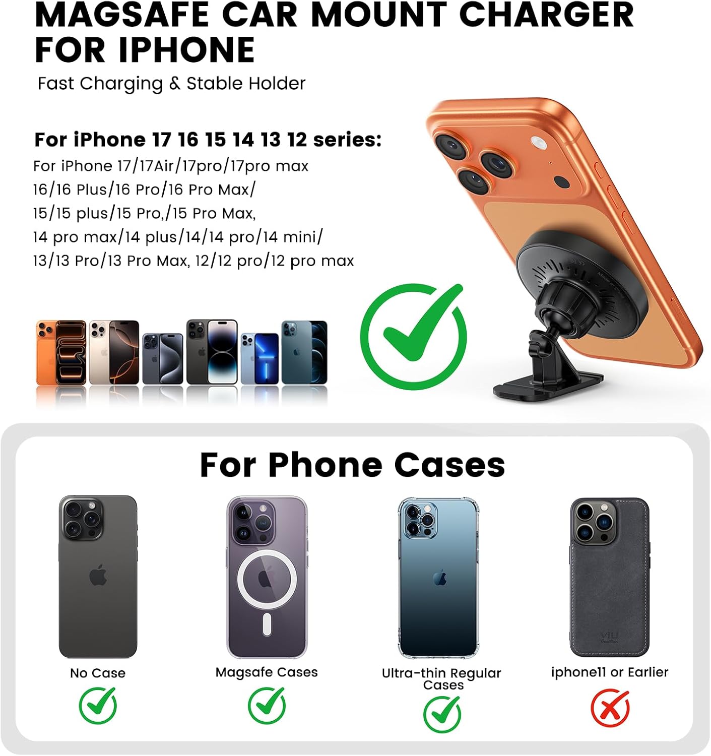 【Applicable Models】This Mag-Safe car mount charger is compatible with iPhone 17/17Pro/17air/ 16/16 Plus/16 Pro/16 Pro Max iPhone 15/15 Plus/15 Pro/15 Pro Max/14/14 Plus/14 Pro/14 Pro Max/13/13 Pro/13 Pro Max/12/12 Pro/12 Pro Max. Not for iPhone 13/12 Mini. If your phone is wearing a magnetic case, Mag-Safe wallet can also be adapted.
