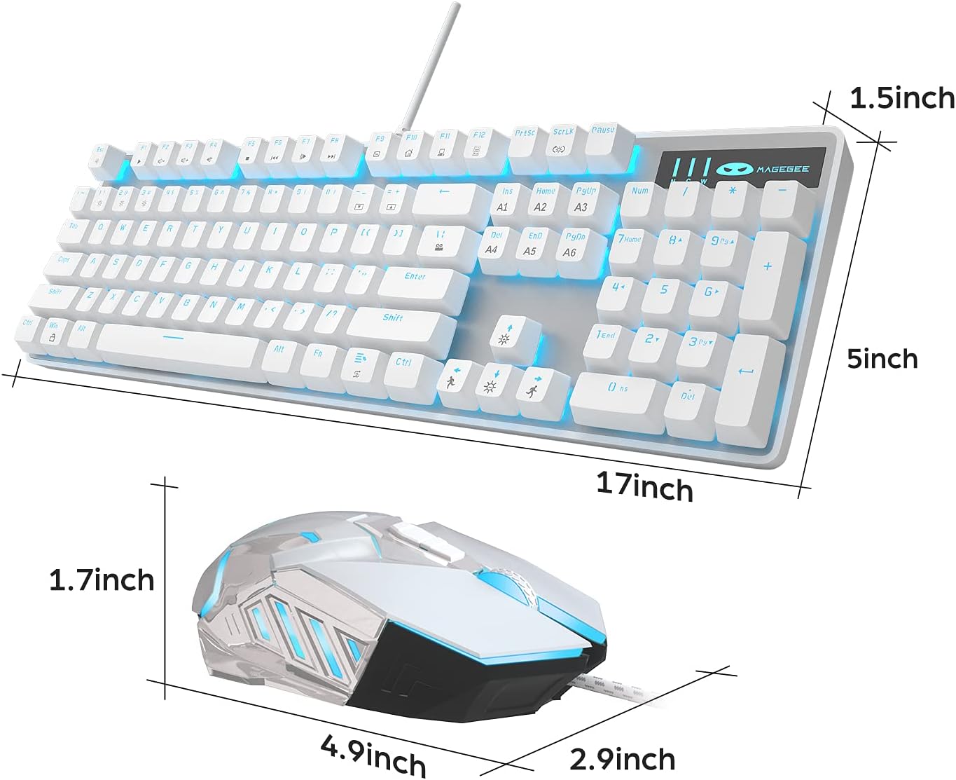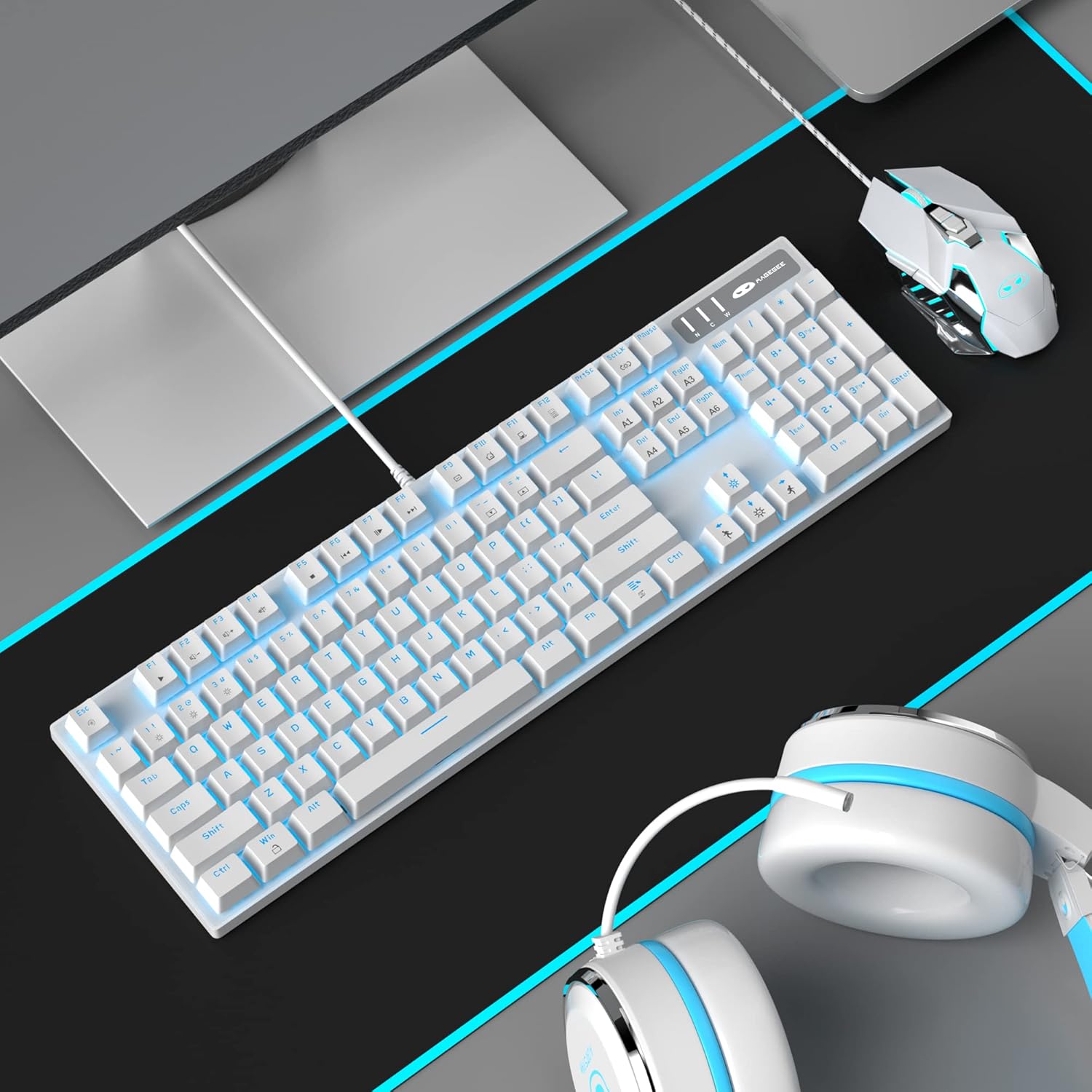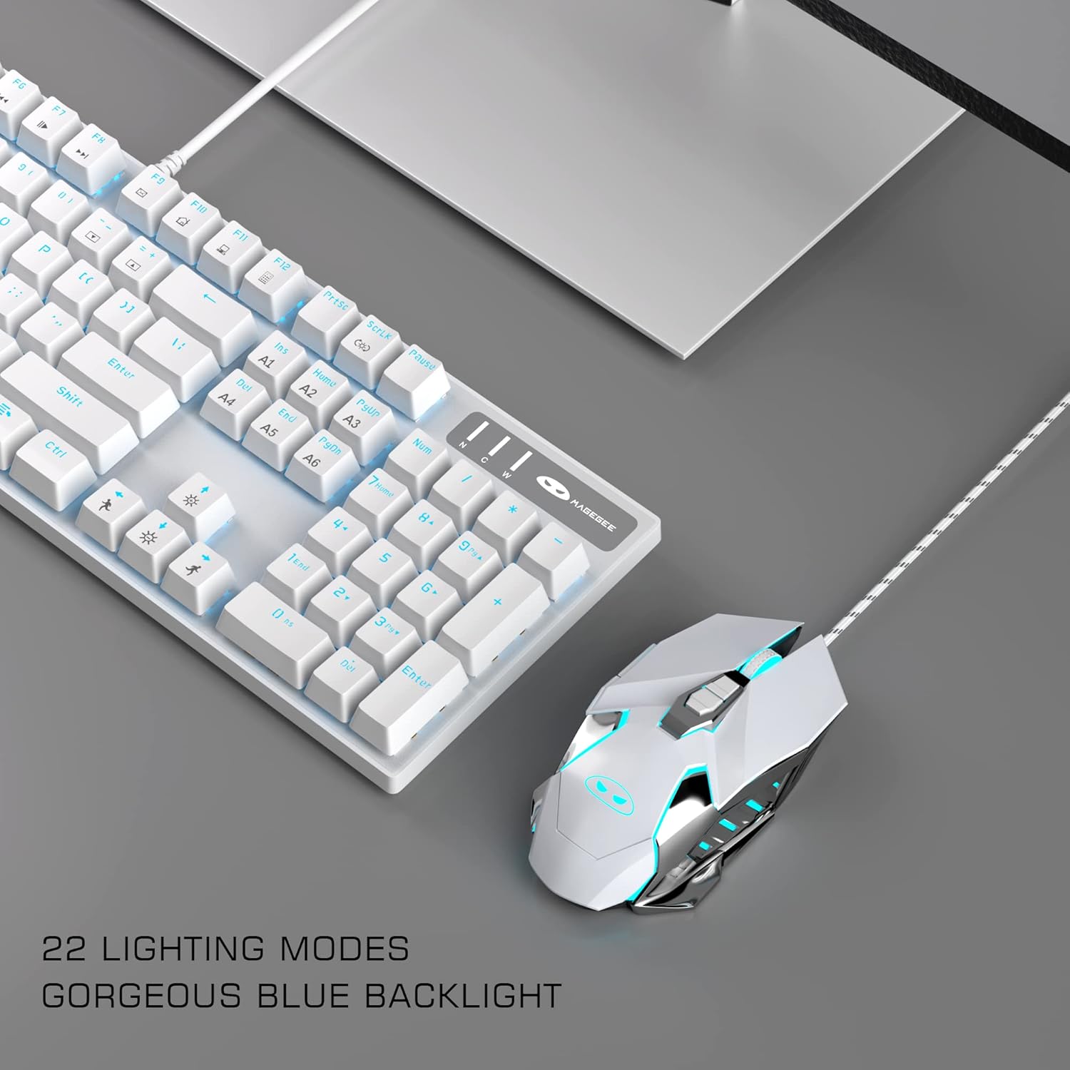 Mechanical Keyboard and Mouse, Wired Blue Backlit Mechanical Gaming Keyboard with Blue Switch, 104 Keys Anti-Ghosting Gaming Keyboard, 7-Color Breathing Backlit Gaming Mouse, White