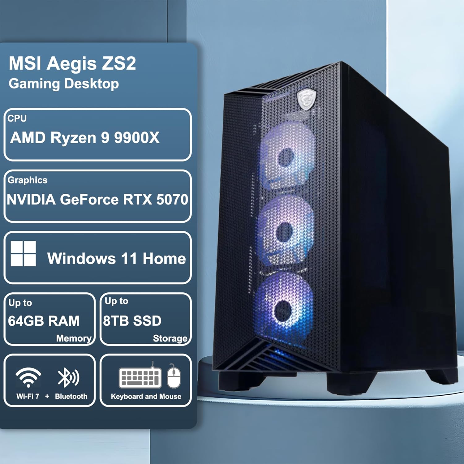 msi Aegis ZS2 Gaming Desktop AMD 12-core Zen 5 Ryzen 9 9900X (Beats i9-14900HX) 32GB RAM 2TB SSD GeForce RTX 5070 DLSS 4 360mm Liquid Cooler 750W 80+ Gold PSU Support HDD Win11 w/ICP Hub