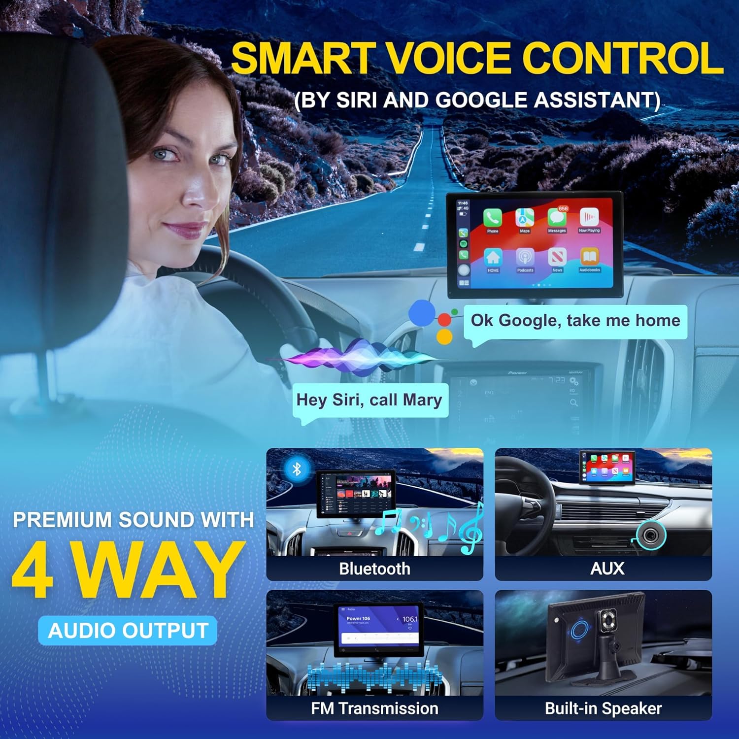 ✅ [Portable Carplay Car Stereo For Apple Carplay & Android Auto] – This system offers you a hands-free experience for seamless integration with your smartphone. The portable car touch screen monitor supports wireless Apple CarPlay and Android Auto via Bluetooth, no need for a separate Apple CarPlay or Android adapter. With voice control through Siri or Google Assistant, you can stay focused on the road while commanding your devices apps, maps/car gps, music, video and more.