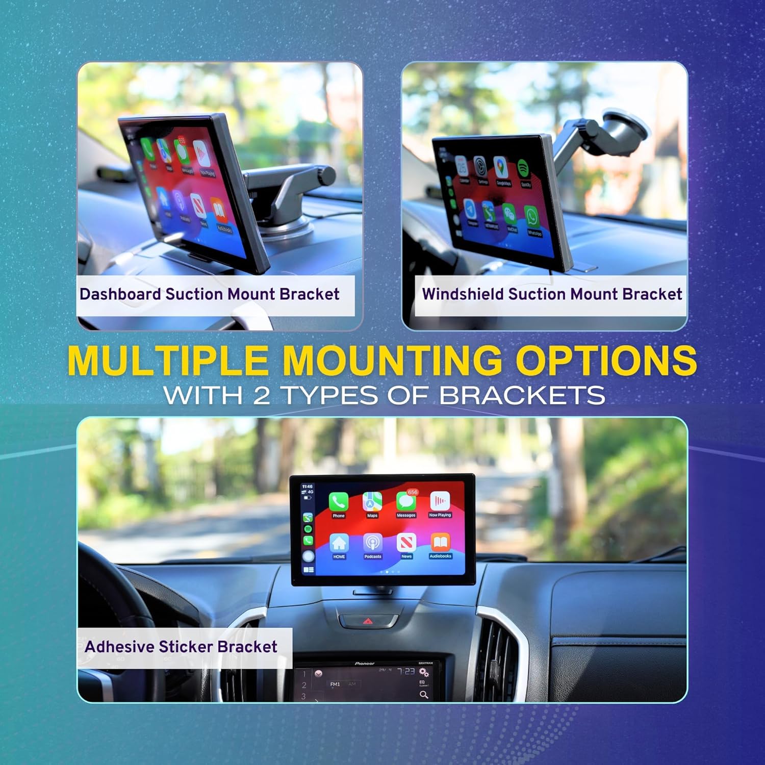 ✅ [Easy To Install & Fits Most Vehicles] – No need to worry about disassembling your car. Our box includes a self-adhesive bracket and a wireless monitor base providing you with multiple installation options that are hassle-free. Simply install it on your dashboard, and you’ll be good. It is powered by a cigarette lighter, suitable for various vehicles such as campers, RVs, cars, trucks, and vans. This no disassemly portable Apple CarPlay and Android Auto device make installation a breeze.