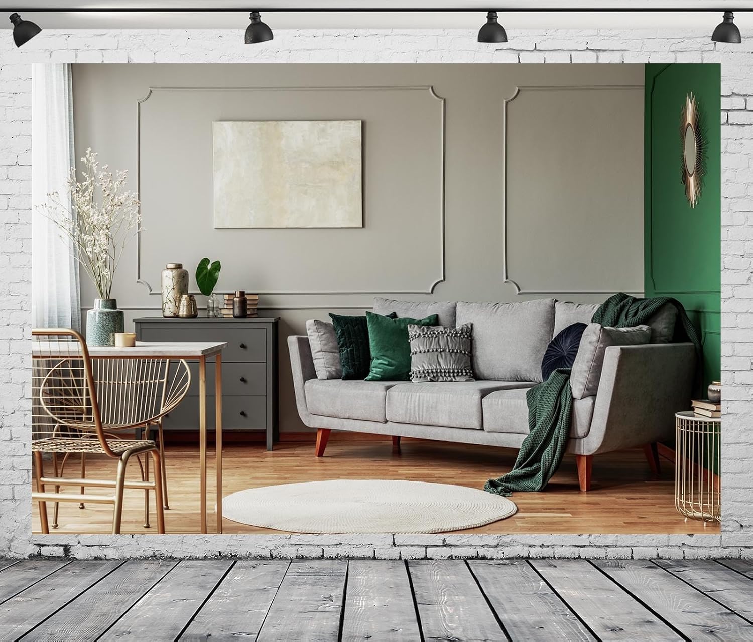 15x10ft Fabric Stylish Living Room Backdrop Green and Grey Interior Room Modern Sofa and Furniture Background Home Office Photo Backdrop for Video Conference Zoom Photo Studio Props