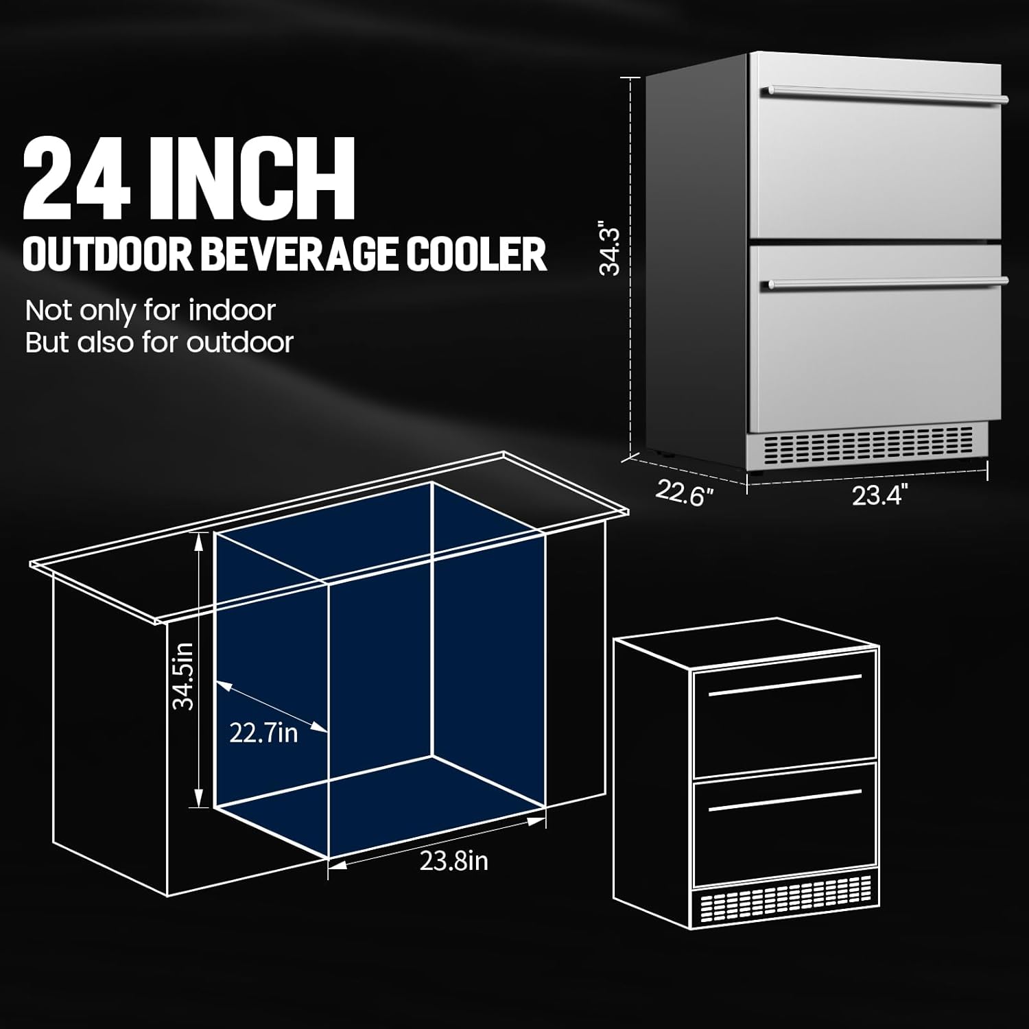 【Spacious Storage】The 24-inch outdoor refrigerator (23.4”W * 22.6”D * 34.3”H) with two drawers can hold 175 standard 12-can packs. It meets the cooling needs of both home and commercial beverage fridges.Automatic defrost function saves you time and effort in maintenance