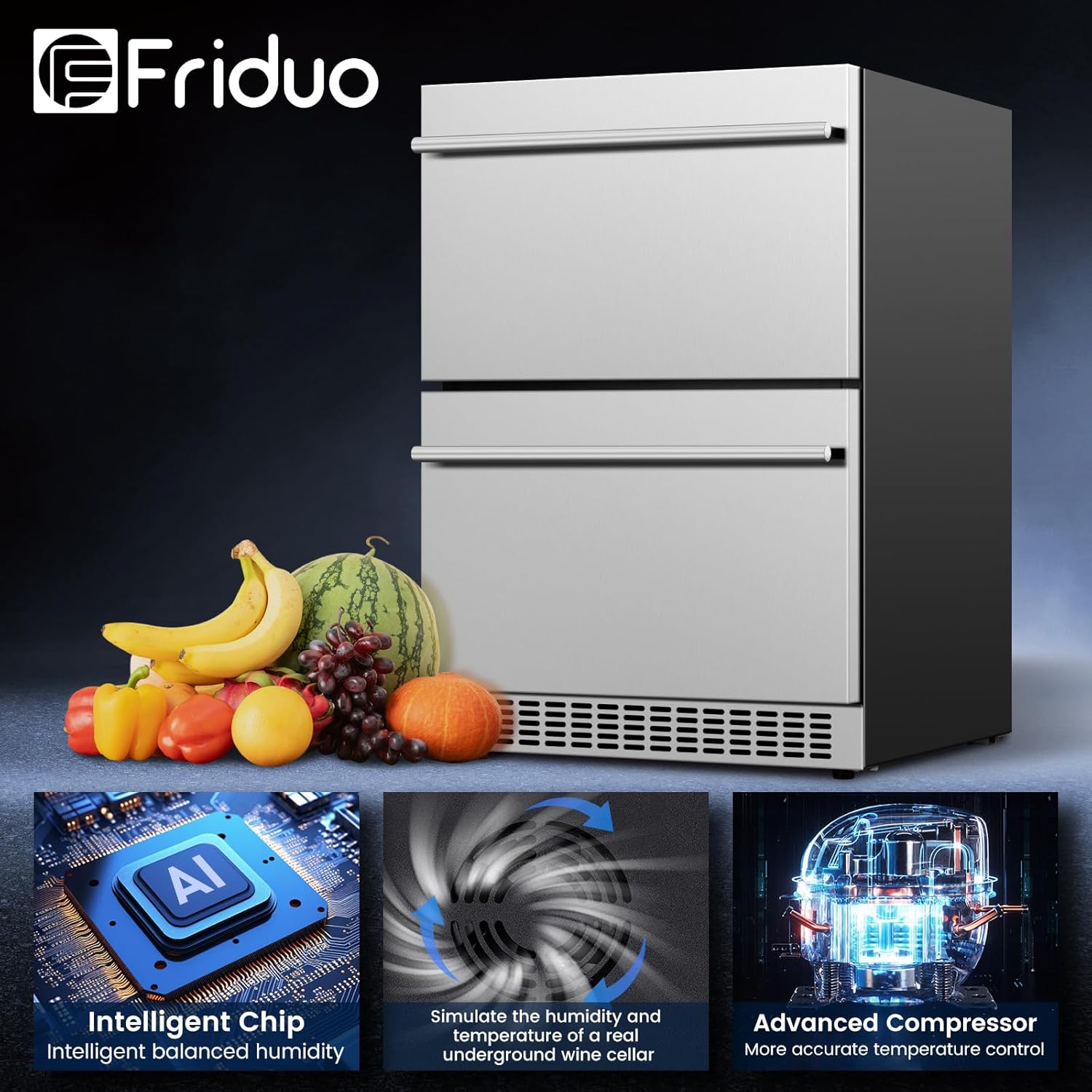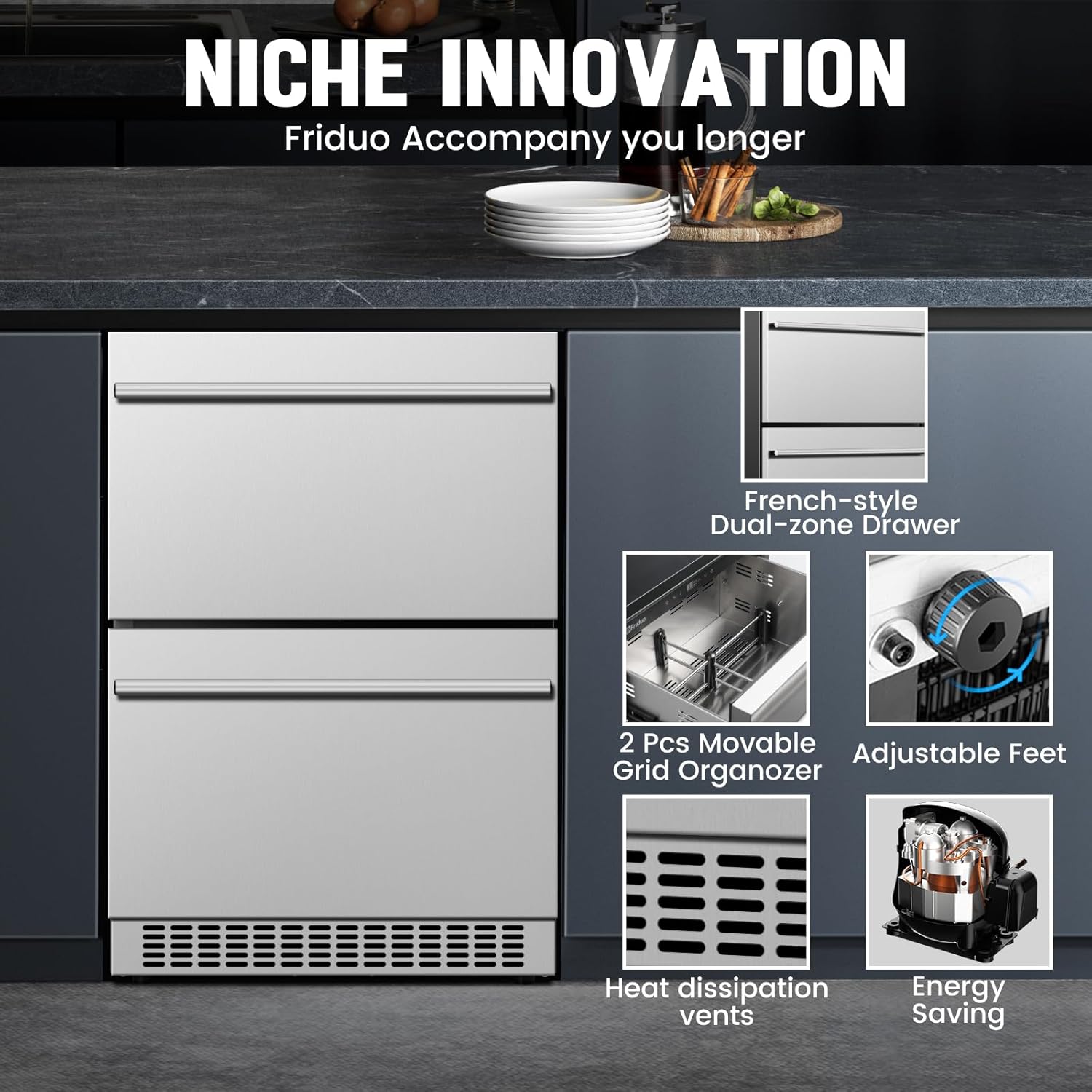 24 inch Outdoor Drawer Beverage Refrigerator, Stainless Steel Door Dual Zone Drawer Fridge Under Counter Freestanding or Built-in, Drink Fridge for Home Kitchen Commercial,Fast Cool,Low Noise