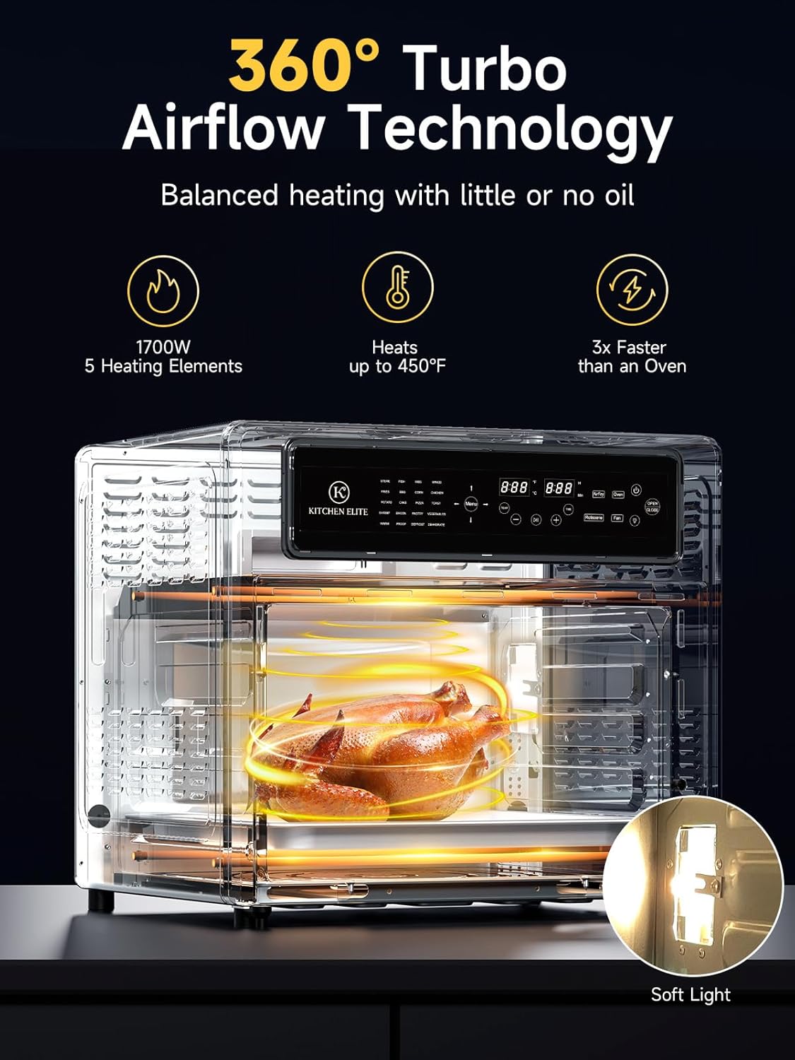 **5 Powerful Heating Elements, Up to 450°F**: Equipped with 5 high-performance heating elements, our air fryer oven quickly reaches up to 450°F for even cooking and perfectly golden results every time.