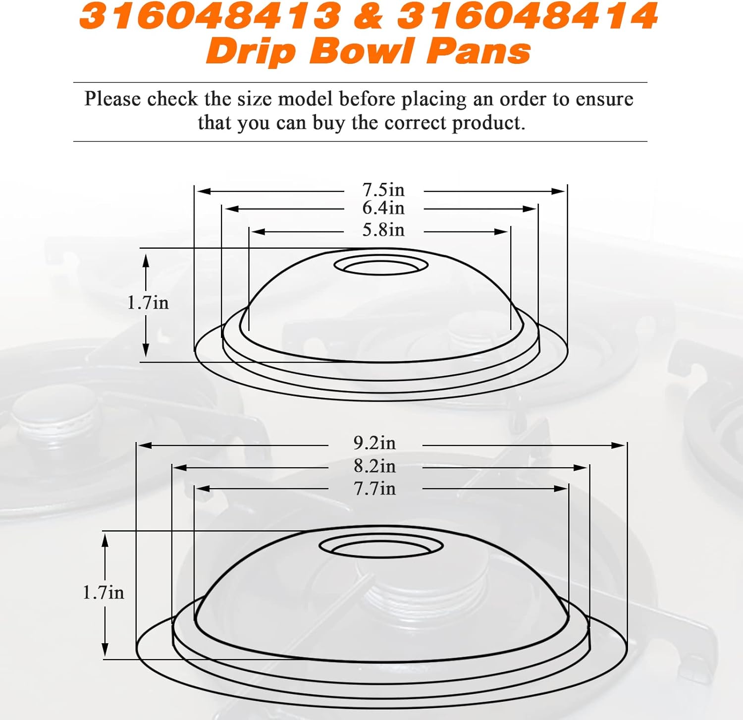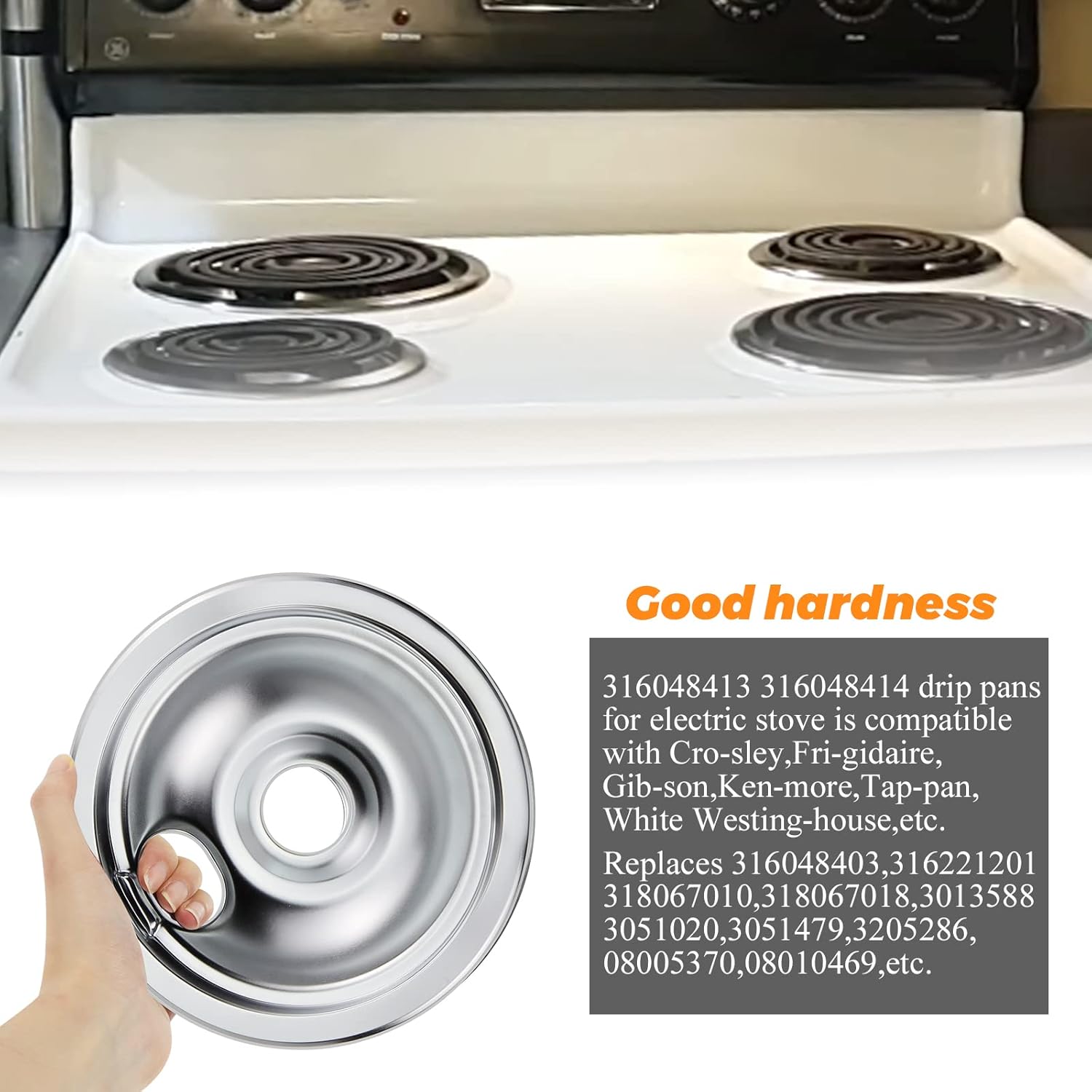 √√ 【316048413 & 316048414 DRIP PAN SET】: 316048413 316048414 frigidaire drip pans for electric stove set includes 4 pack of electric range drip pans: 2 x 6-inch 316048414 electric stove burner drip pans and 2 x 8-inch 316048413 kenmore drip pans.6″ burner drip pans (316048414) measures 7.5 inch ; 8″ electric range drip pans (316048413) measure 9.3 inch in diameter,Sliver in color .316048413 316048414 electric stove burner drip pans is made of thicker Chrome Plated Steel,using eco-friendly plating techniques,which effectively reduces the case of bending.Please measure your drip pan before buying Size so that you can order an accurate replacement for your stove