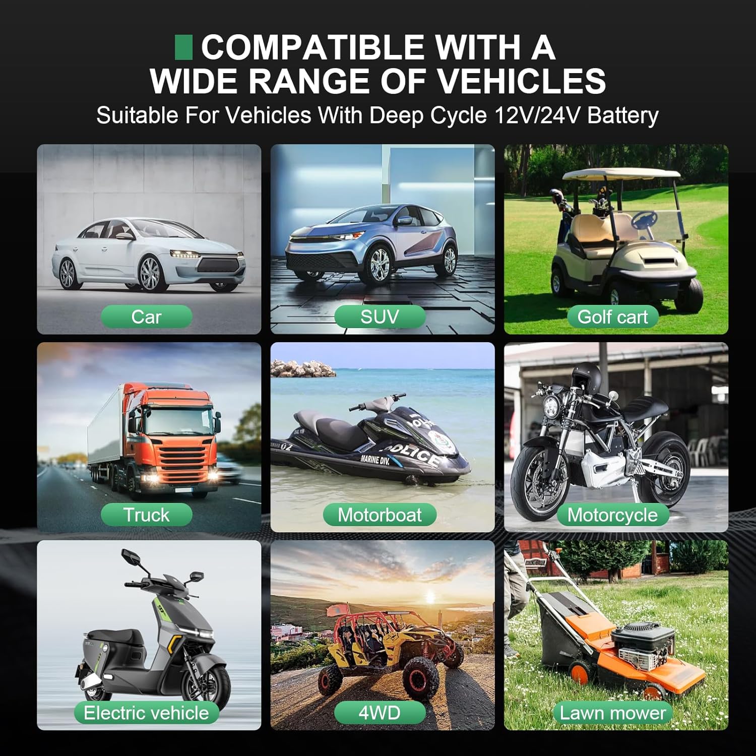 Product Accessories: You will receive 1 x smart battery charger, 1 x SB-50A style plug, 1 x Alligator clip,1 x user manual,1x50A 6AWG Connector .Our smart lifepo4 battery charger is an indispensable tool in your garage or car for all automotive, marine, and deep cycle batteries, including flooded lead-acid batteries in AGMs, GELs, SLAs, cars, trucks, SUVs, motorcycles, lawnmowers, boats, and more. With this multifunctional battery charger, you can say goodbye to all your battery troubles.