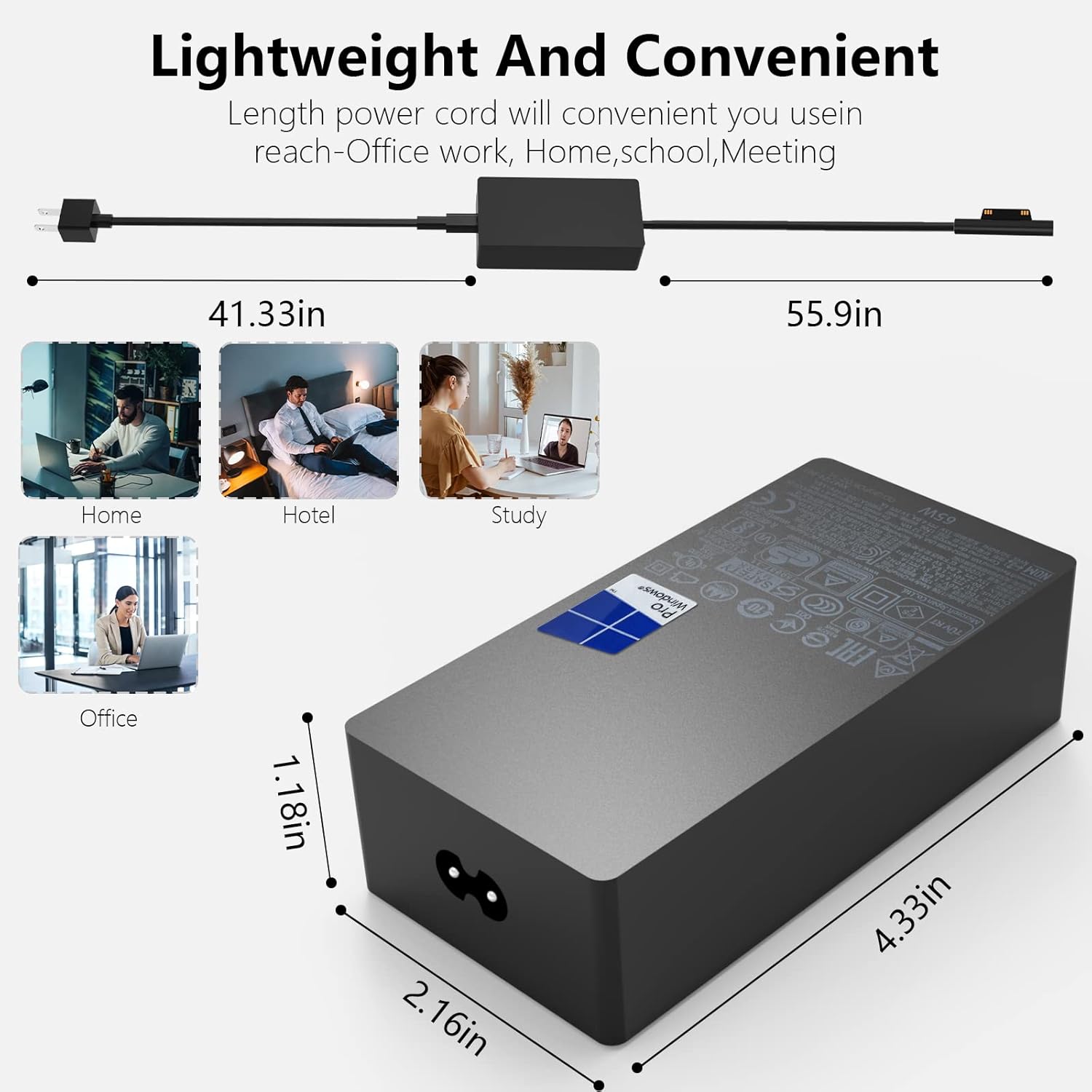 Specification: Model: MU65W-A1706; Input(AC): 100-240V 50/60 Hz; Output(DC): 15V- 4A 65W; USB Port: 5V-1A 5W USB 2.0(for cell Phones);And also compatible with Microsoft Surface pro 44W 15V-2.58A and 36W 12V-2.58A.