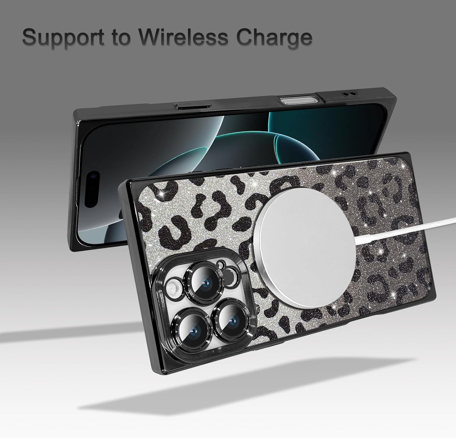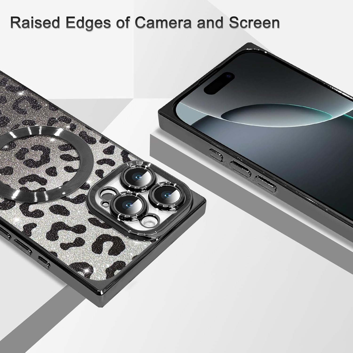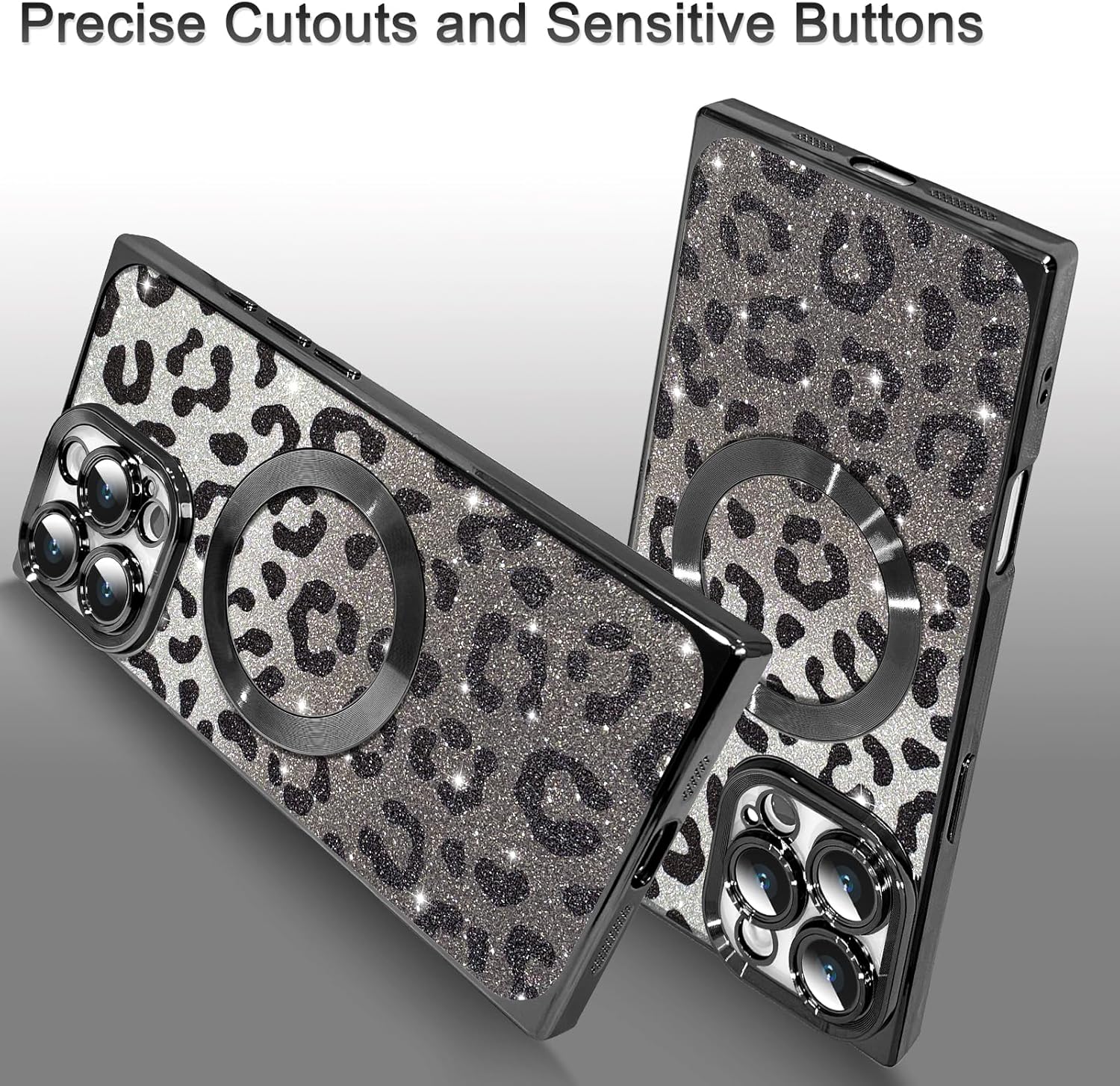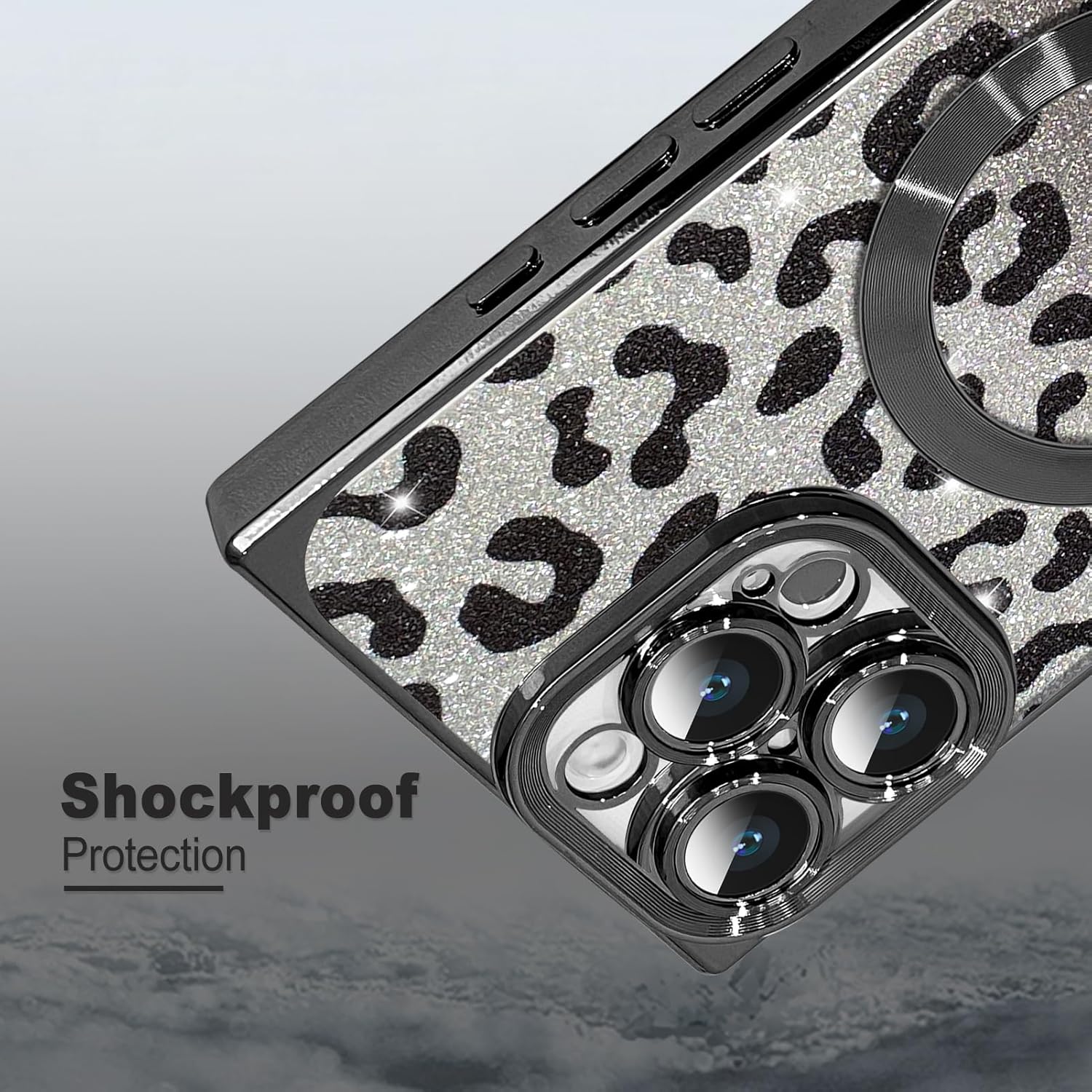AIGOMARA Phone Case for iPhone 16 Pro Max [Compatible with MagSafe] Leopard Print Design Glitter Bling Case Shockproof Scratch-Resistant Soft TPU Cover for Women – Black