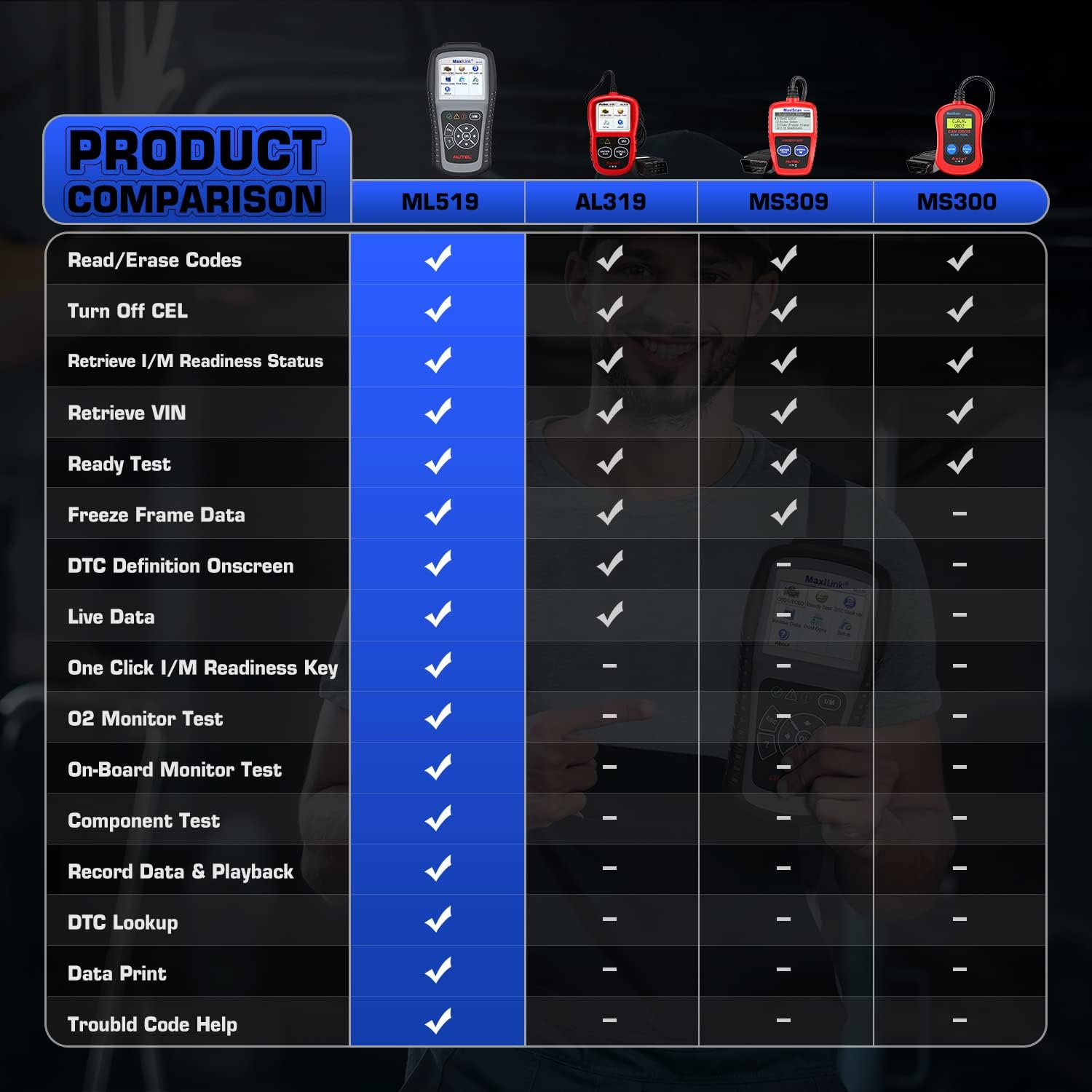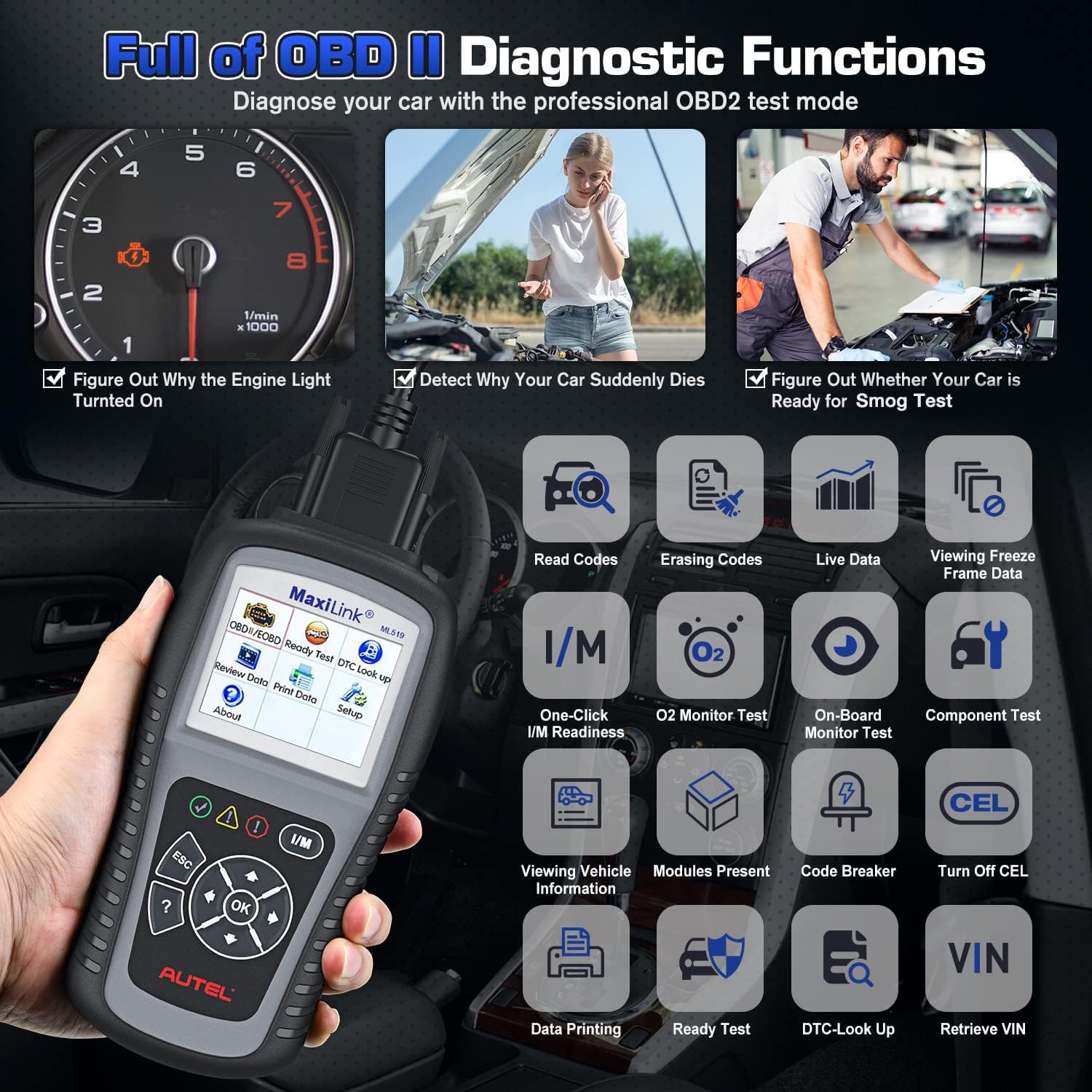 đ„ăTURN OFF CHECK ENGINE LIGHTăAutel ML519 is an enhanced OBDII scanner that allows you to check all engine related fault codes, figure out check engine light alerts and perform proper repair with the definitions and tips displayed for DTCs and turn off the Malfunction Indicator Light(MIL). The auto diagnostic scanner can locate bad O2 sensors, perform EVAP tests(Mode 8), On-Board Monitor Tests(Mode 6) and component tests, check misfire and fuel system and retrieve vehicle information and etc.