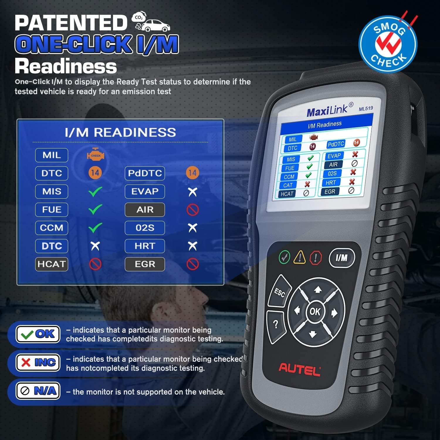 đ„ăPATENTED ONE-CLICK I/M READINESS FUNCTIONăLooking for a scanner that can tell you if if your car is âReadyâ for a smog test? No need the expensive scanner. The the most cost effective Autel ML519 can help you solve the problem. Donât waste money on a failed smog test! ML519 can retrieve I/M Readiness status to make sure OBD2 monitors on your car are âReadyâ, monitors like misfire, fuel, catalyst, O2 sensors, EVAP, etc, to help you pass the annual smog check.