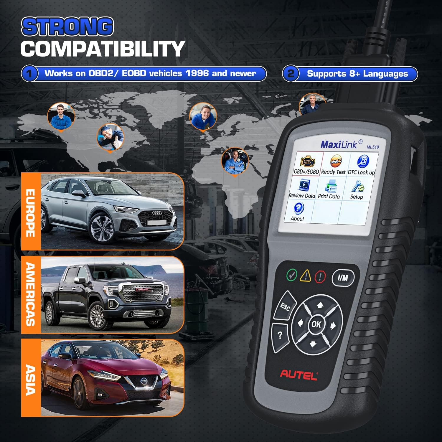 đ„ăUNMATCHED OBDII VEHICLE COVERAGEăAutel ML519 car diagnostic scanner supports all OBD2 protocols: KWP2000, ISO2000, ISO9141, J1850 VPW, J1850 PWM and CAN. AL519 car diagnostic tool is compatible with all obdii-compliant vehicles: sedans, SUVs and light trucks post 1996 in US, post-2006 for EU-based and post 2009 for Asia-based cars.