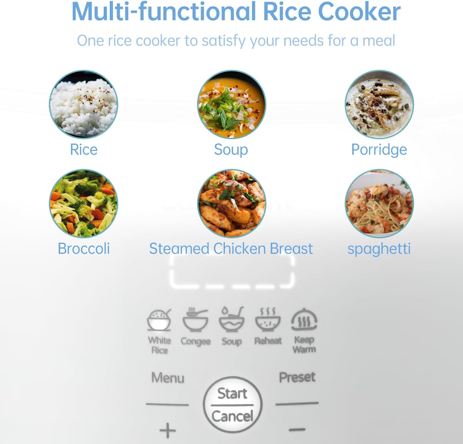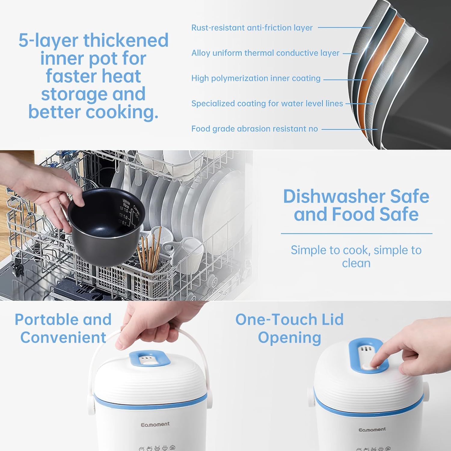 【Multifunctional choice】 Eamoment’s rice cooker has six different functions: Whitem Rice/Congee/Soup/Reheat/Keep Warm/Preset. In addition to easily cooking white rice/brown rice and oatmeal,you can also use it to cook various dishes such as soup, porridge, noodles, etc.