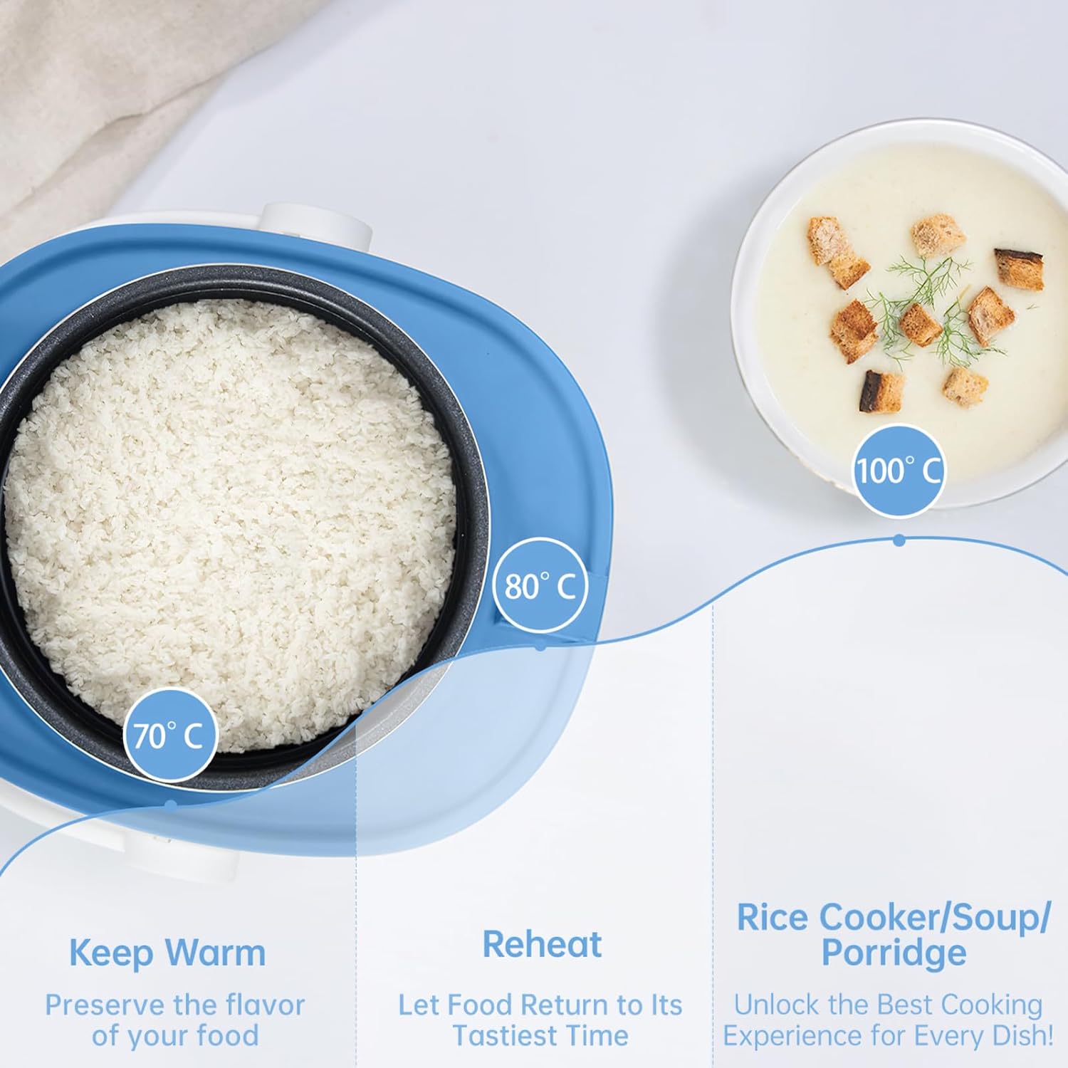 【PORTABLE】A small mini rice cooker (6.29in*7.08in*7.87in) is a great addition to your kitchen supplies. The small rice cooker has a portable handle, so you can take it with you when traveling to eat delicious and healthy food anytime and anywhere;you can also take it with you to the office to share your newly cooked delicious food with your colleagues.